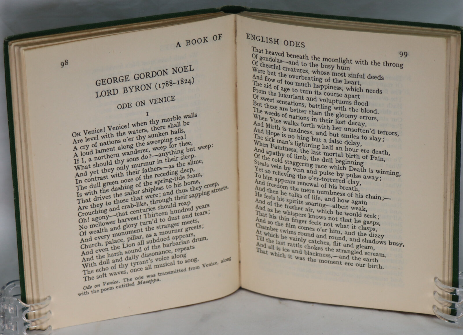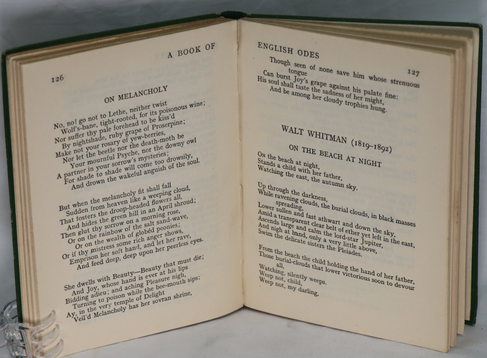 The book is beautifully printed and made. It contains a selection of poems from Keats, Shelley, Masefield, Wordsworth, Coleridge, Dryden, Ben Johnson and others.