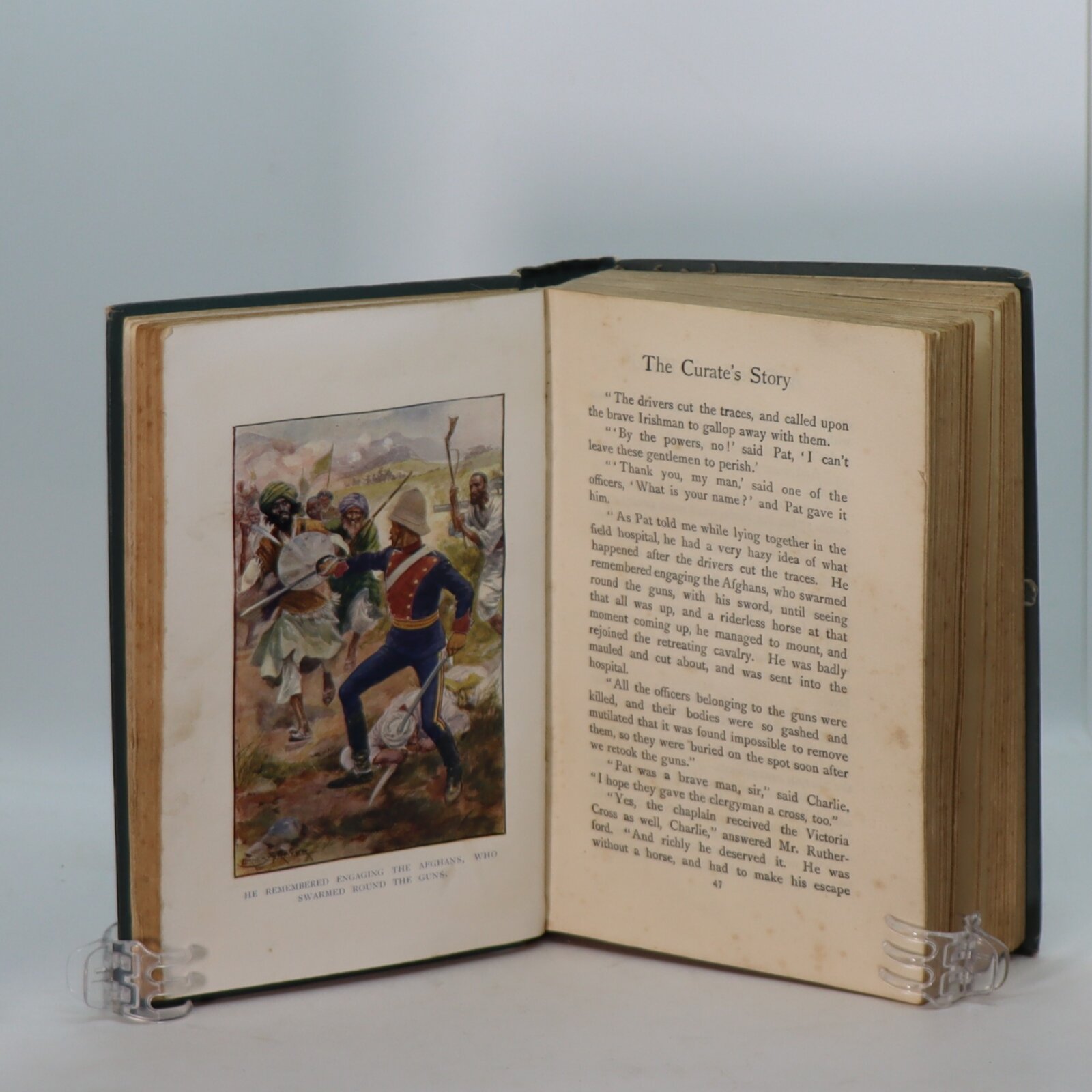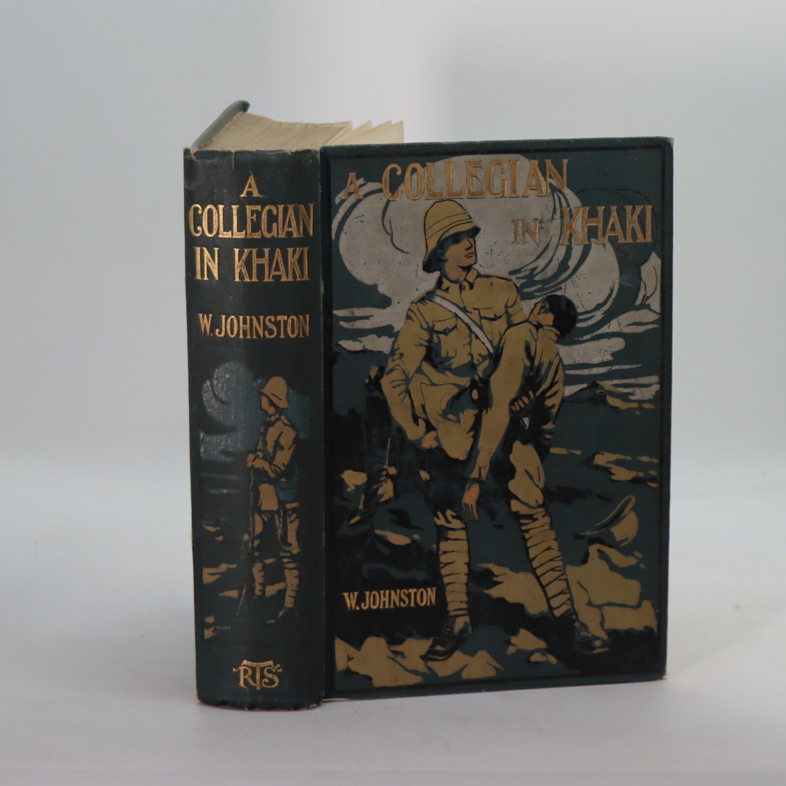 Green cloth binding with gilt title and soldier carrying a wounded comrade on the front board. Soldier and title on the spine.