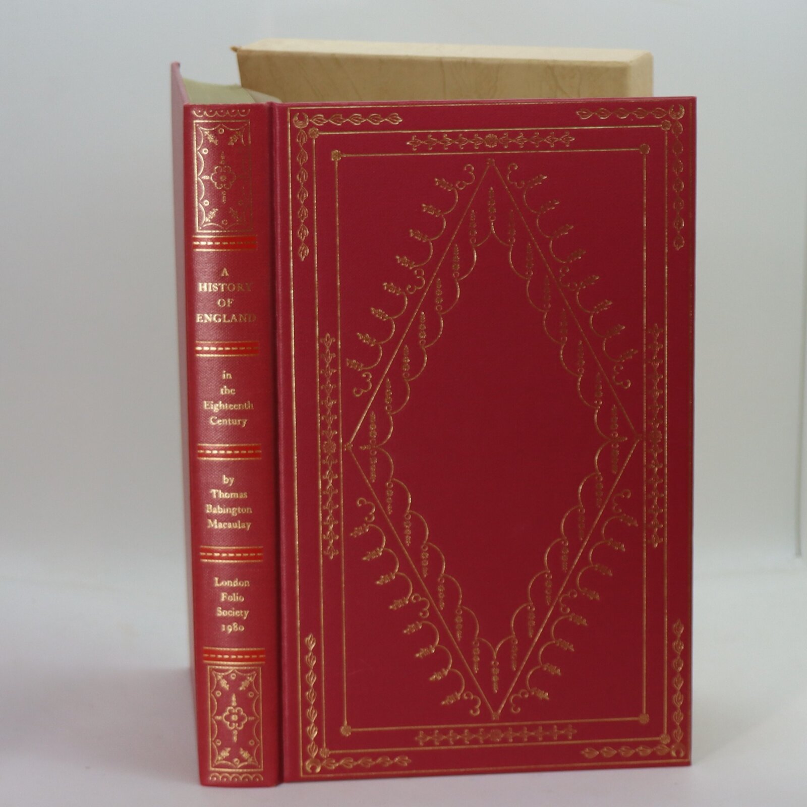 In a fitted box. Red cloth binding with gilt banding and title on the spine. Gilt edging and diamond design on the front board.