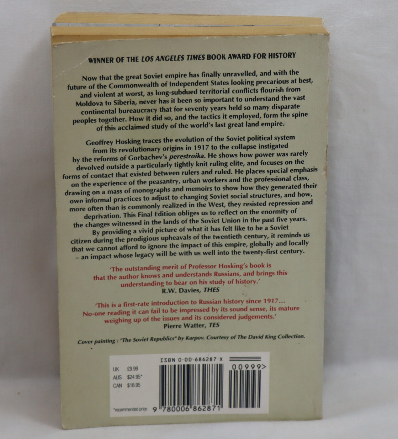 WINNER OF THE ‘LOS ANGELES TIMES’ BOOK AWARD FOR HISTORY: Now that the great Soviet empire has finally unravelled, and with the future of the Commonwealth of Independent States looking precarious at best, and violent at worst, as long-subdued territorial conflicts flourish from Moldova to Siberia, never has it been so important to understand the vast continued bureaucracy that for seventy years held so many disparate peoples together. How it did so, and the tactics it employed, form the spine of this acclaimed study of the world’s last great land empire. Geoffrey Hosking traces the evolution of the Soviet political system from its revolutionary origins in 1917 to the collapse instigated by the reforms of Gorbachev’s ‘perestroika’. He shows how power was rarely devolved outside a particularly tightly knit ruling elite, and focuses on the forms of contact that existed between rulers and ruled. He places special emphasis on the experience of the peasantry, urban workers and the professional class, drawing on a mass of monographs and memoirs to show how they generated their own informal practices to adjust to changing Soviet social structures, and how, more often than is commonly realized in the West, they resisted repression and deprivation. This Final Edition obliges us to reflect on the enormity of the changes witnessed in the lands of the Soviet Union in the past five years. By providing a vivid picture of what it has felt like to be a Soviet citizen during the prodigious upheavals of the twentieth century, it reminds us that we cannot afford to ignore the impact of this empire, globally and locally – an impact whose legacy will be with us well into the twenty-first century. “The outstanding merit of Professor Hosking’s book is that the author knows and understands Russians, and brings this understanding to bear on his study of history.”