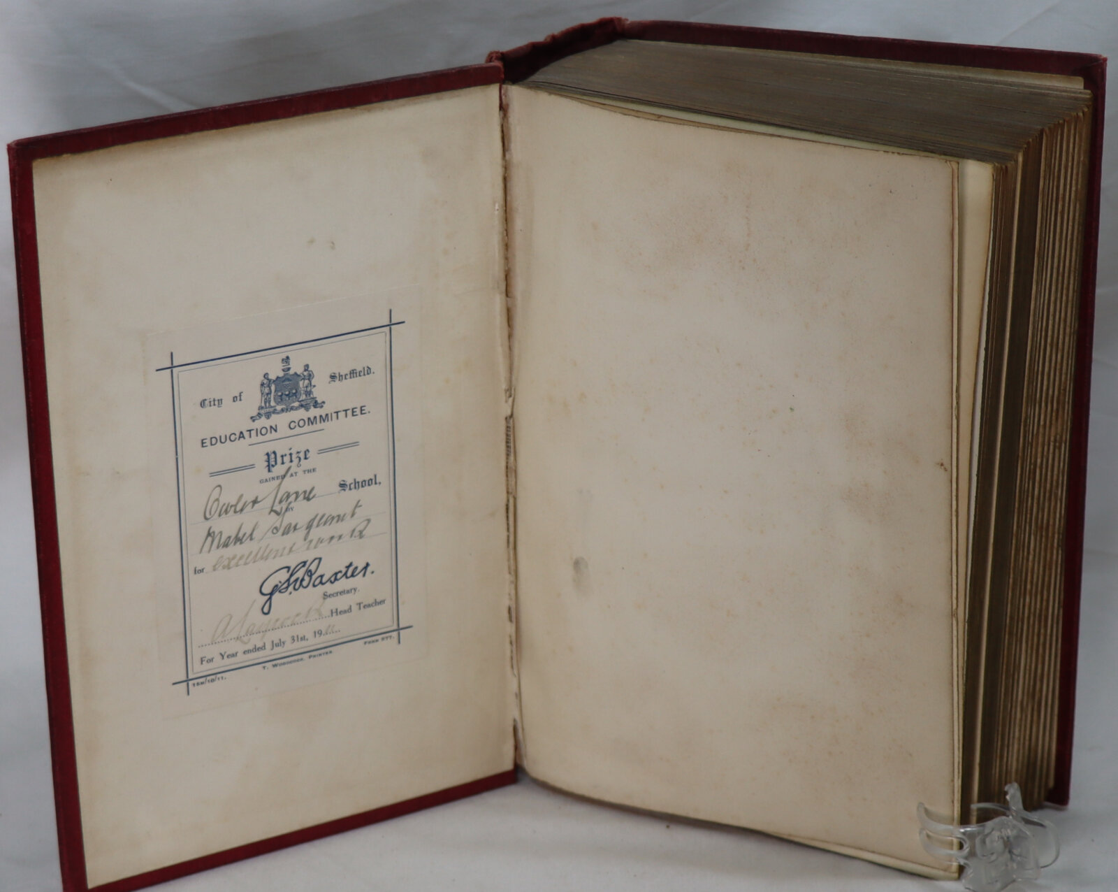 Red cloth binding with gilt title and girl decoration on the spine and front board.