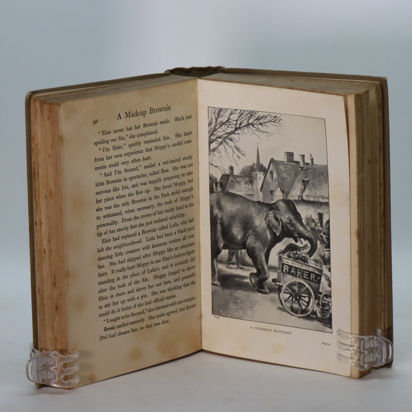 Kaki cloth binding with black title on the front board. Black title and brownie figure on the spine.