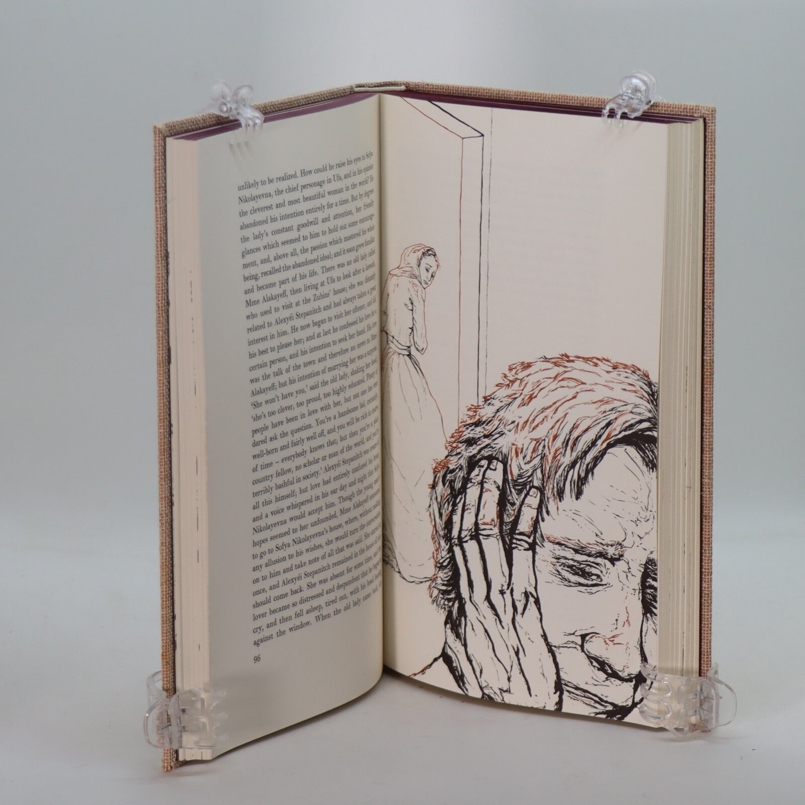In a fitted box. Cream hessian cloth with leather title plate and gilt lettering on the spine.