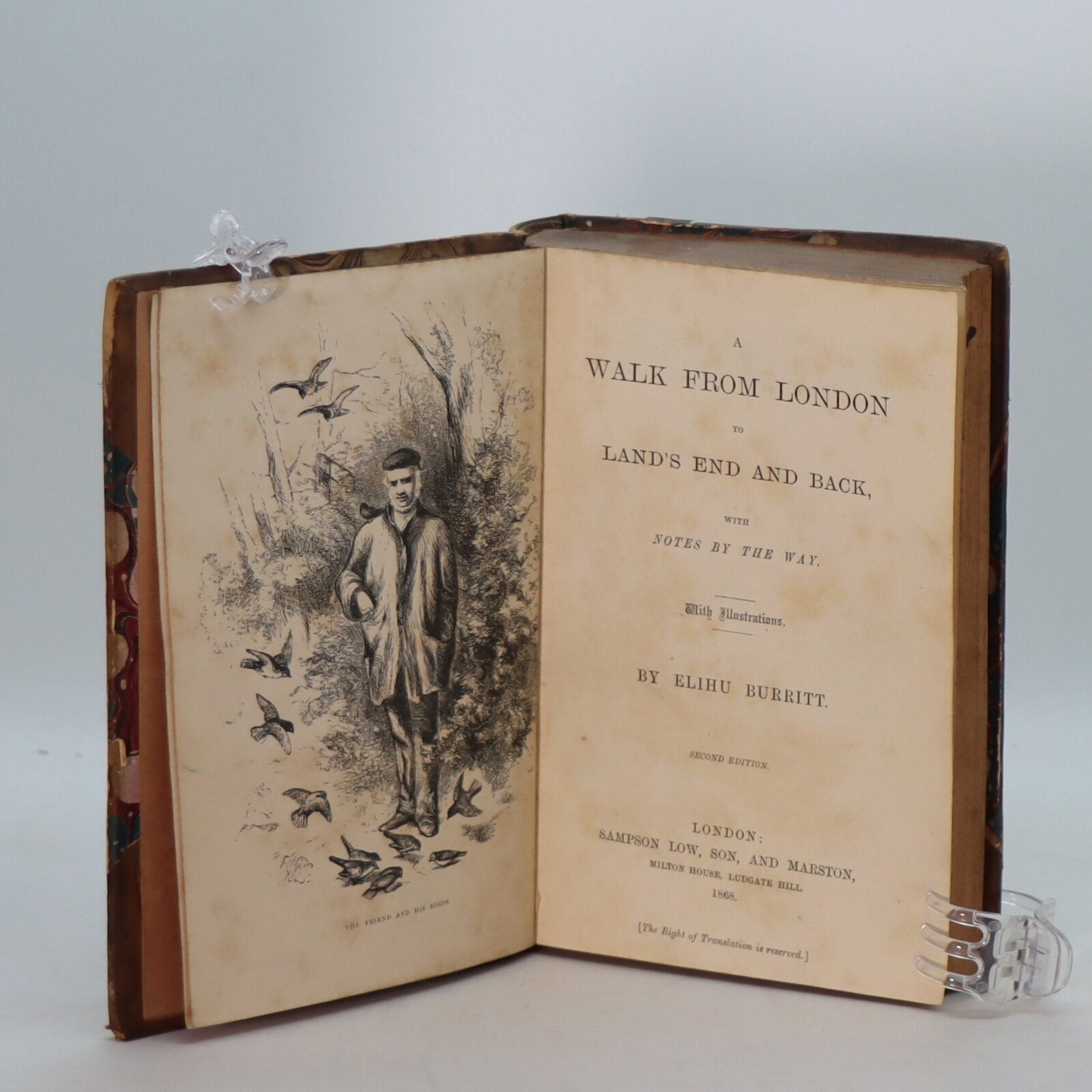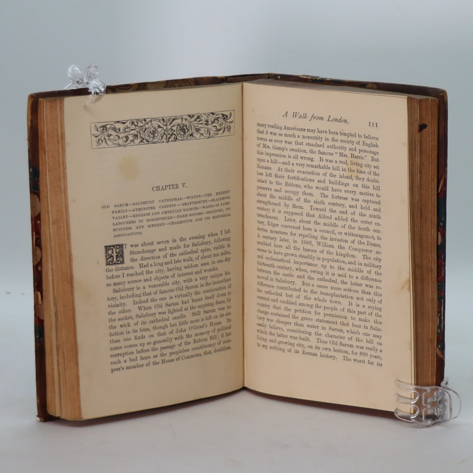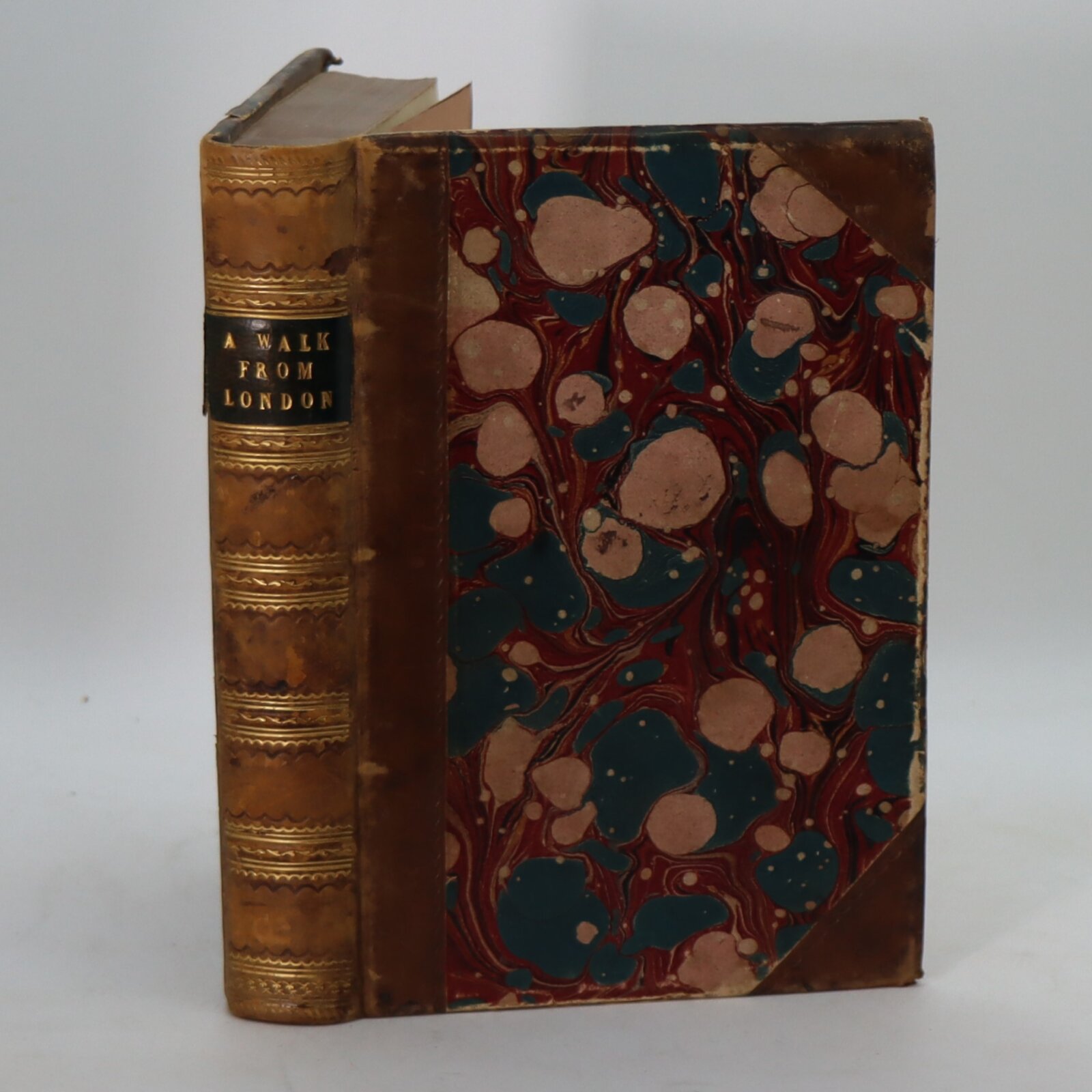 Tan calf spine with green title plate , gilt banding and lettering. Red, green and pink marbled boards.