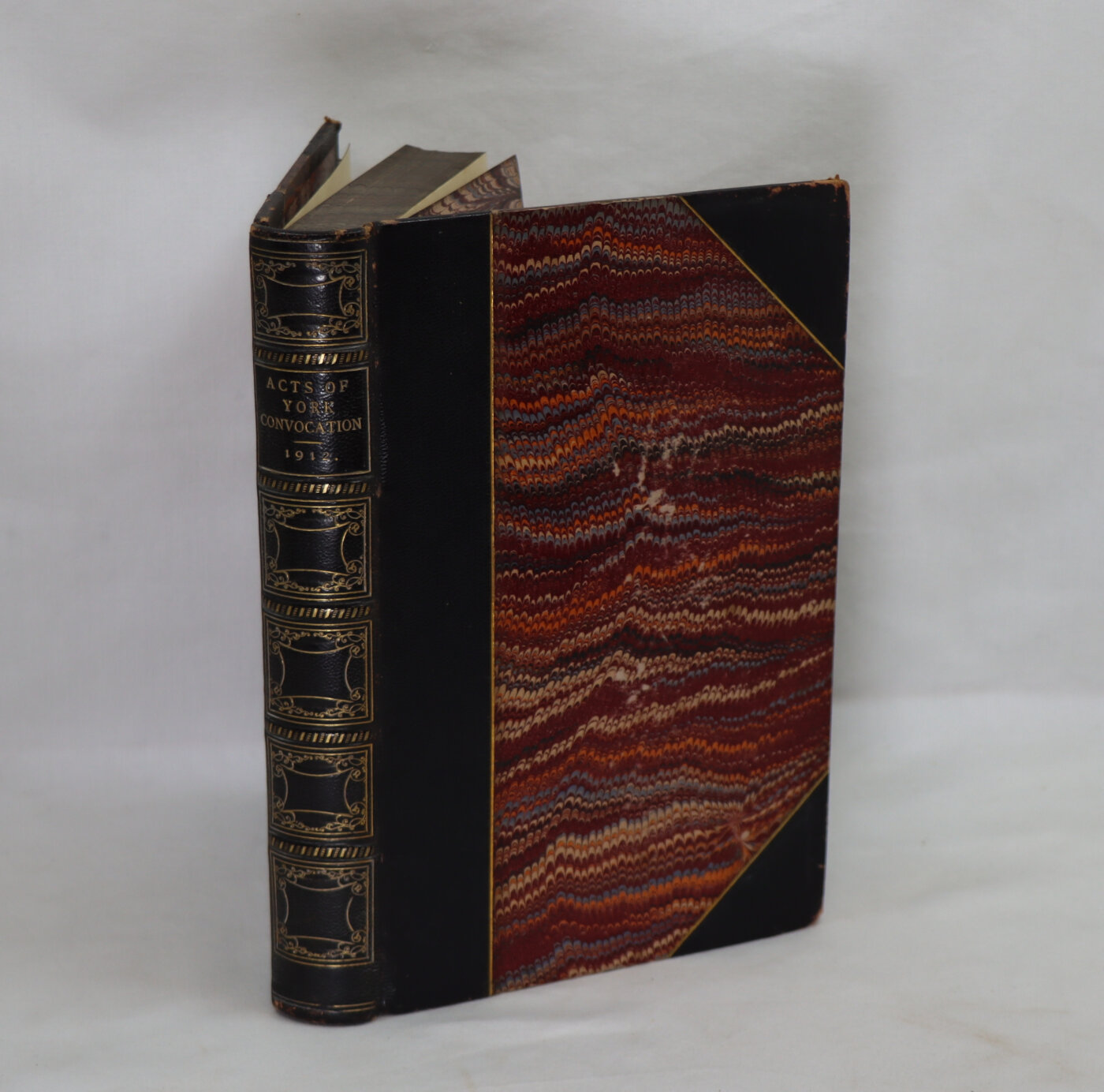 Black calf spine with gilt title and decoration on the spine. Brown marbled boards.
