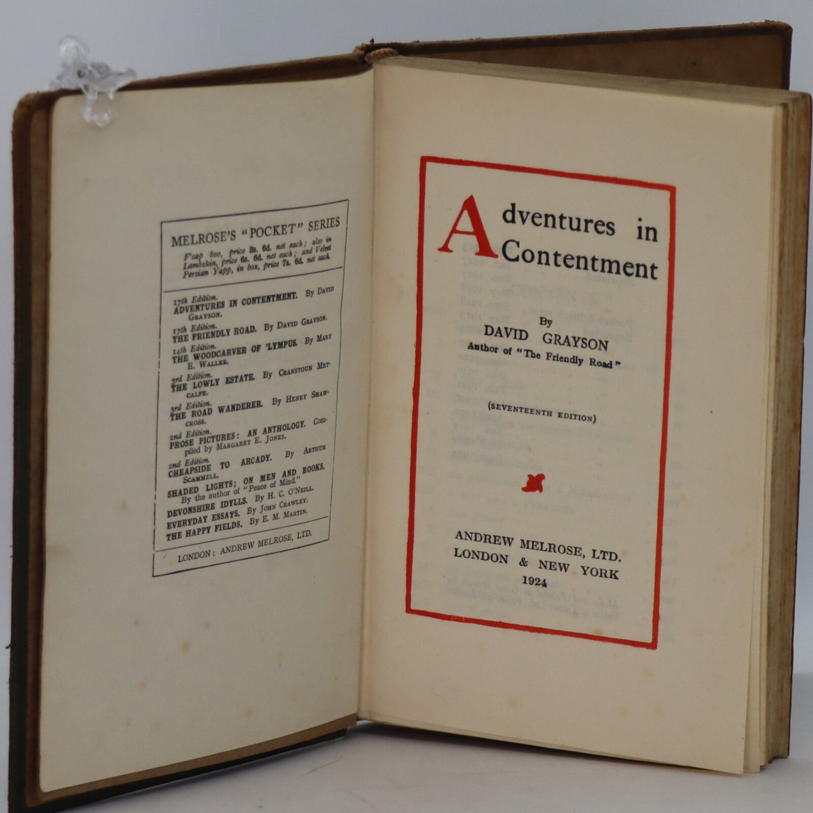 Volume 3 of Grayson’s books., Adventures in Contentment, Adventures in Friendship and The Friendly Road. Hardcover. Thomas Fogarty (illustrator). inscribed by Heber J. Grant. Frontispiece illustration in full colour. Very good. Inscribed by the seventh president of the Church of Jesus Christ of Latter-day Saints, Heber J. Grant, in pencil on the verso of the front free endpaper