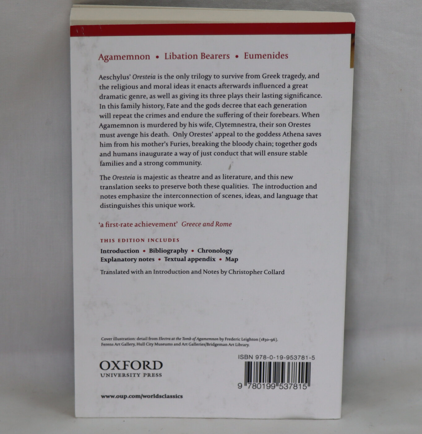 The most famous series of ancient Greek plays, and the only surviving trilogy, is the “”Oresteia of Aeschylus””, consisting of the “”Agamemnon””, “”Choephoroe”” (‘Libation Bearers’) and “”Eumenides”” (‘Kindly Ones’). These three plays recount the murder of Agamemnon by his queen Clytemnestra on his return from Troy with the captive Trojan princess Cassandra; the murder in turn of Clytemnestra by their son Orestes; and Orestes’ subsequent pursuit by the Avenging Furies (Eumenides) and eventual absolution.There has been no shortage of translations and adaptations of the “”Oresteia””, but such are the poetic complexities of Aeschylus’ language and the remoteness of the world he depicts that they mostly fall far short of either the literal meaning or the spirit of the original. This translation by an eminent scholar stays as close to the text as English idiom will allow and is perfectly adapted to the student’s needs. Notes elucidate the difficulties, and introductions to each play set the trilogy against the background of Greek religion as a whole and Greek tragedy in particular, presenting a true assessment of Aeschylus’ dramatic art.