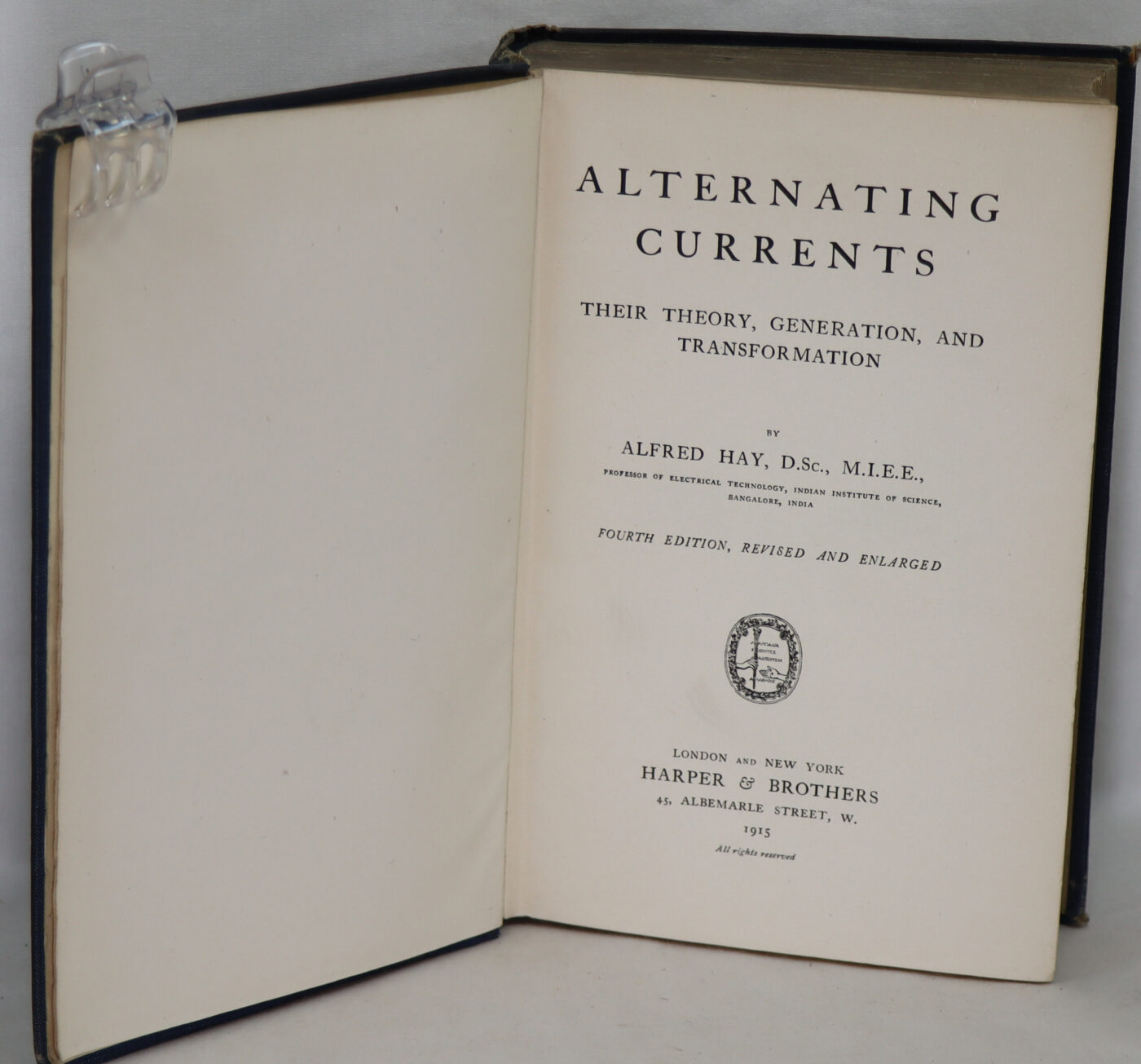 This book (a fourth edition) was collected by Jack’s father. This book delves into the intricate world of alternating currents, providing a comprehensive guide to their theory, generation, and transformation. The author, an expert in the field, presents a systematic exploration of alternating current phenomena, tracing its evolution from early theoretical concepts to practical applications in electrical engineering. With a focus on understanding the fundamental principles, the book examines the behavior of alternating currents in circuits containing resistance, inductance, and capacitance. It delves into the concepts of impedance, phase difference, and power factor, equipping readers with the tools to analyze and design alternating current systems. The author explores the practical aspects of alternating current generation and transformation, discussing the operation of alternators, transformers, and other essential components. Through detailed explanations and illustrative examples, the book sheds light on the challenges and solutions encountered in the transmission and distribution of alternating currents. By providing a thorough grounding in the theory and applications of alternating currents, this book serves as an invaluable resource for electrical engineers, students, and anyone seeking a deeper understanding of this fundamental aspect of electrical science. Its insights illuminate the intricate workings of alternating currents and their indispensable role in shaping our technological advancements.