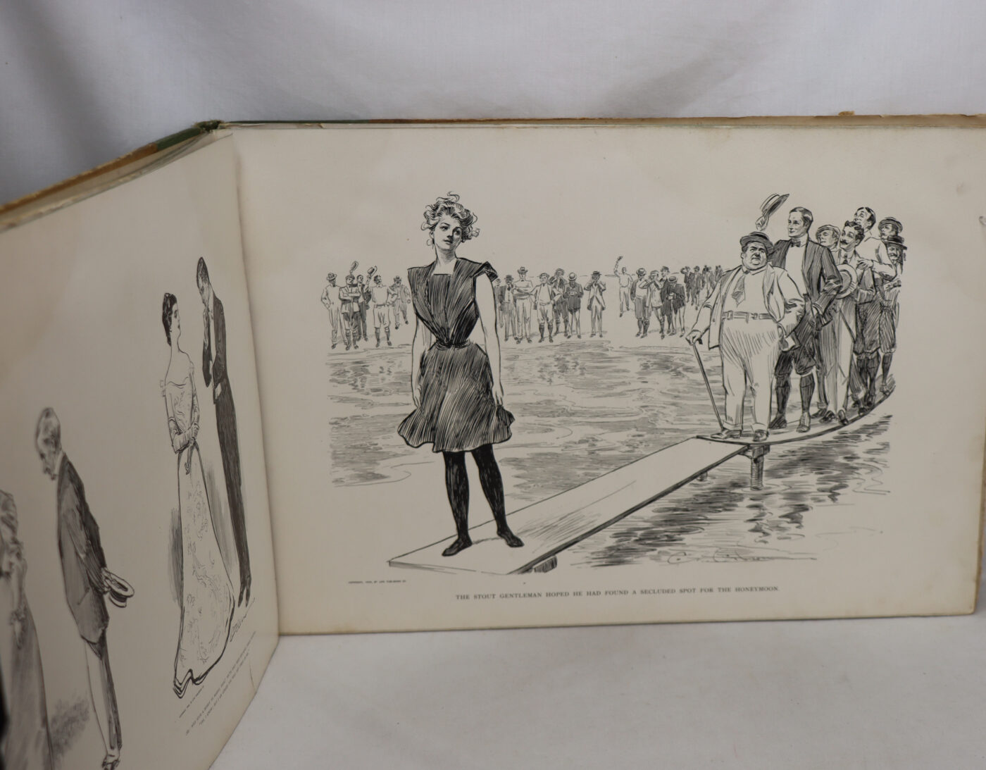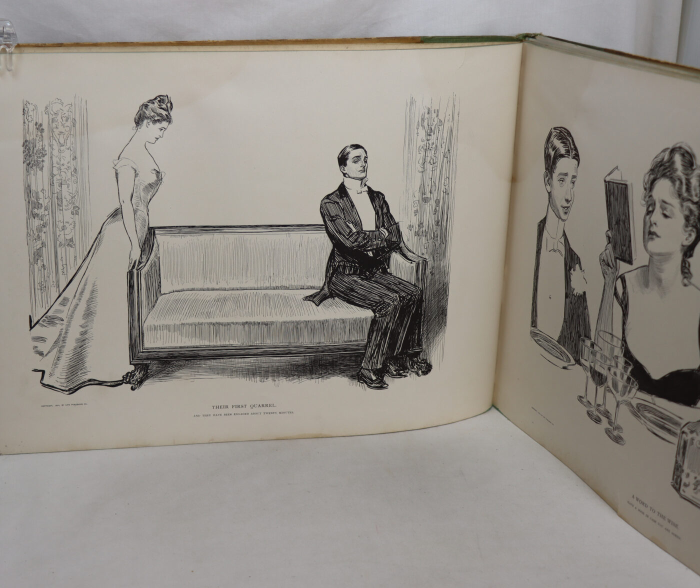 Tan board binding with green cloth spine. Brow title and seated lady drawing on th front board.