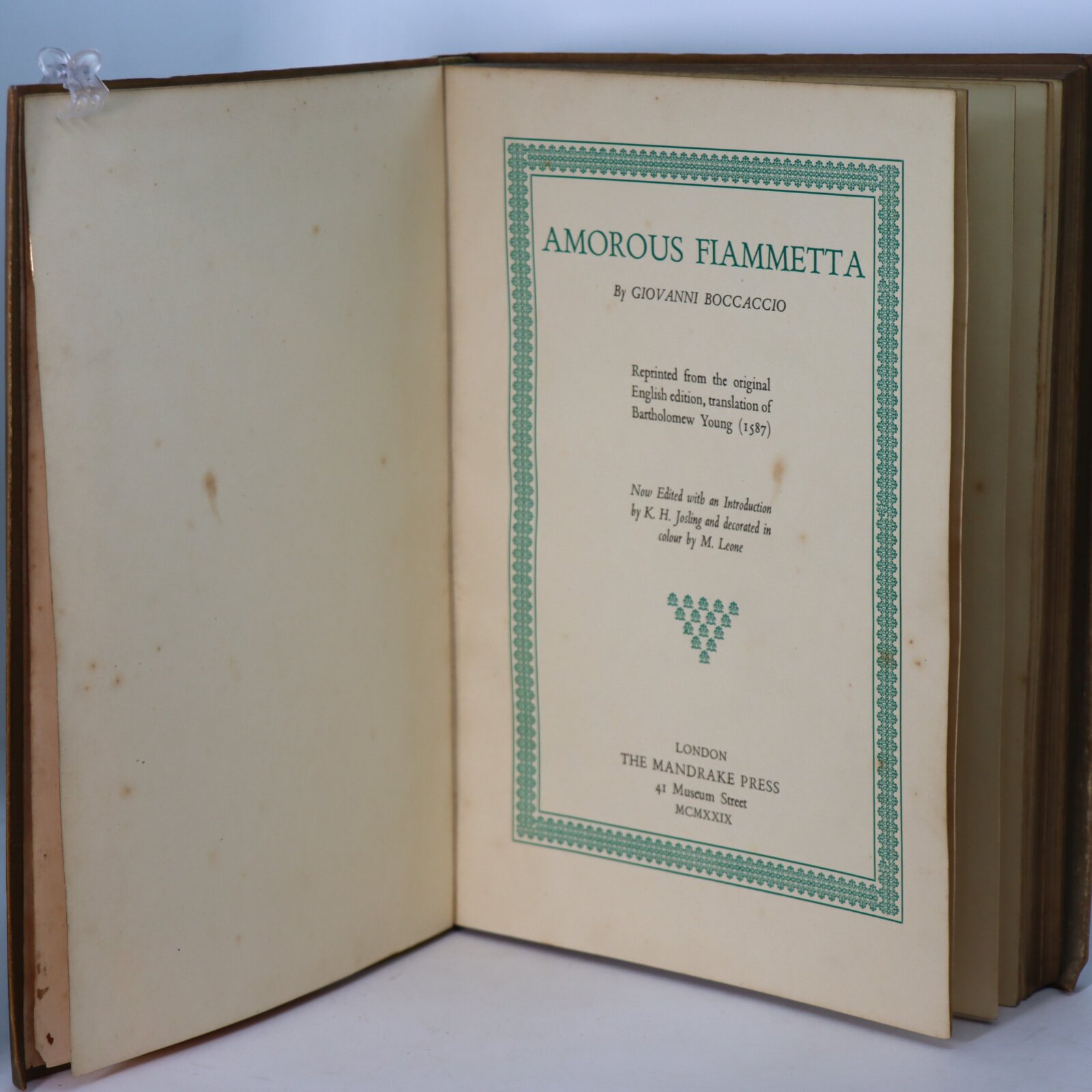 Giovanni Boccaccio was an Italian author and poet, a friend, student, and correspondent of Petrarch, and important Renaissance humanist, best known for the Decameron. Amorous Fiammetta, or The Elegy of Lady Fiammetta describes Fiammetta’s passion for Panfilo, a Florentine merchant, and has been described as the first psychological novel in Western literature.