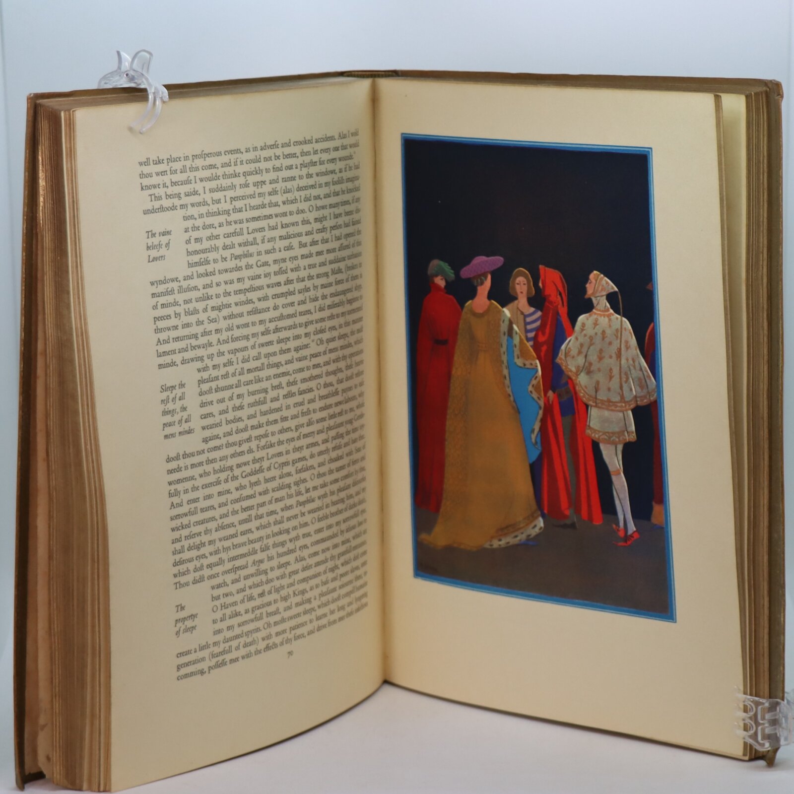 Greenish gold leatherette binding with gilt title on the spine. Gilt three ladies on the front board. All edges gilt. Limited to 550 copies.