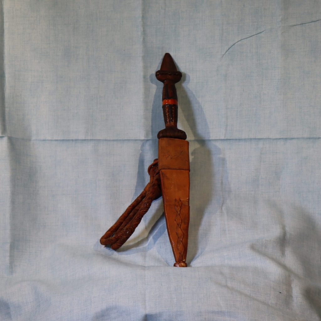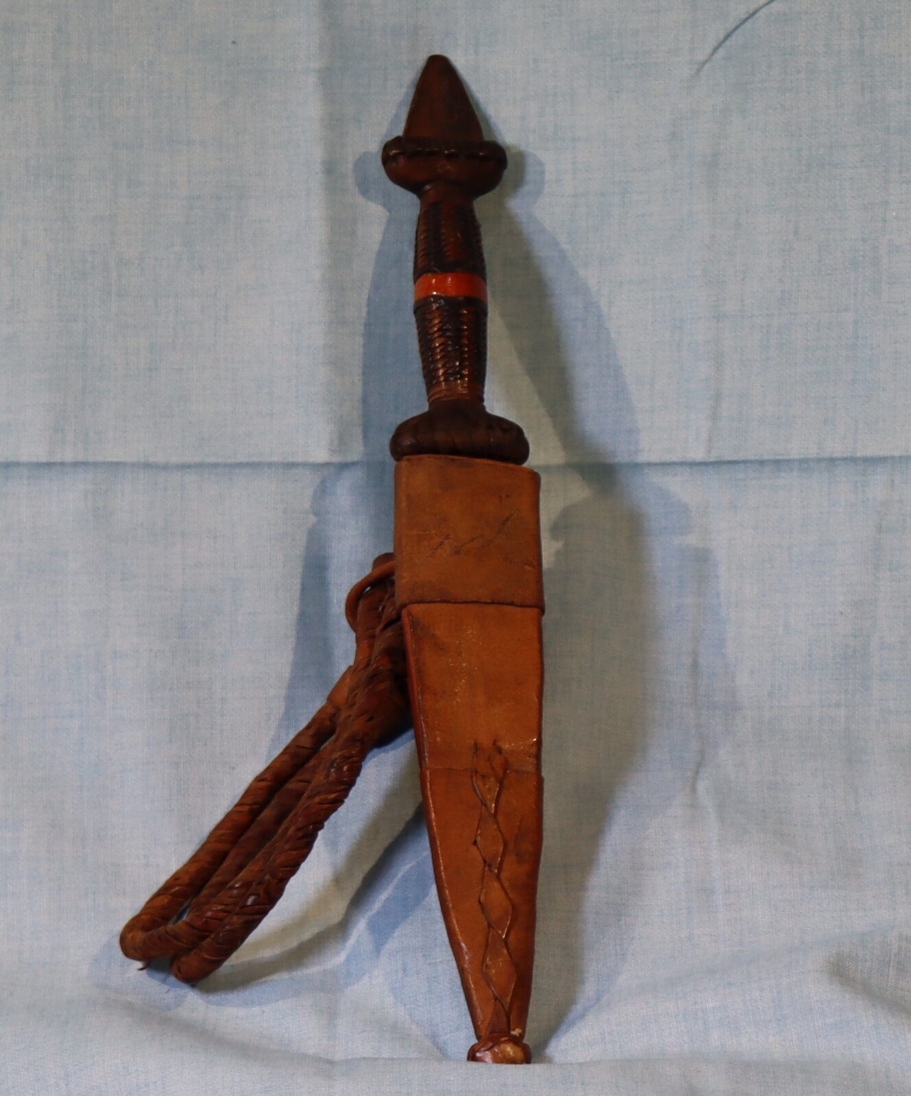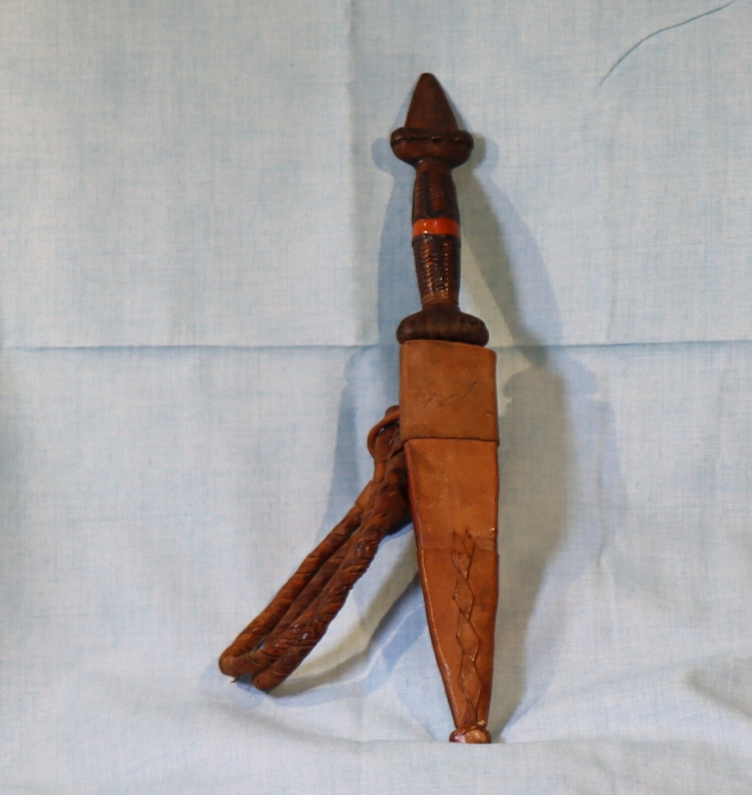 Small fighting knife in a leather sheath. with braided leather belt loop and handle.