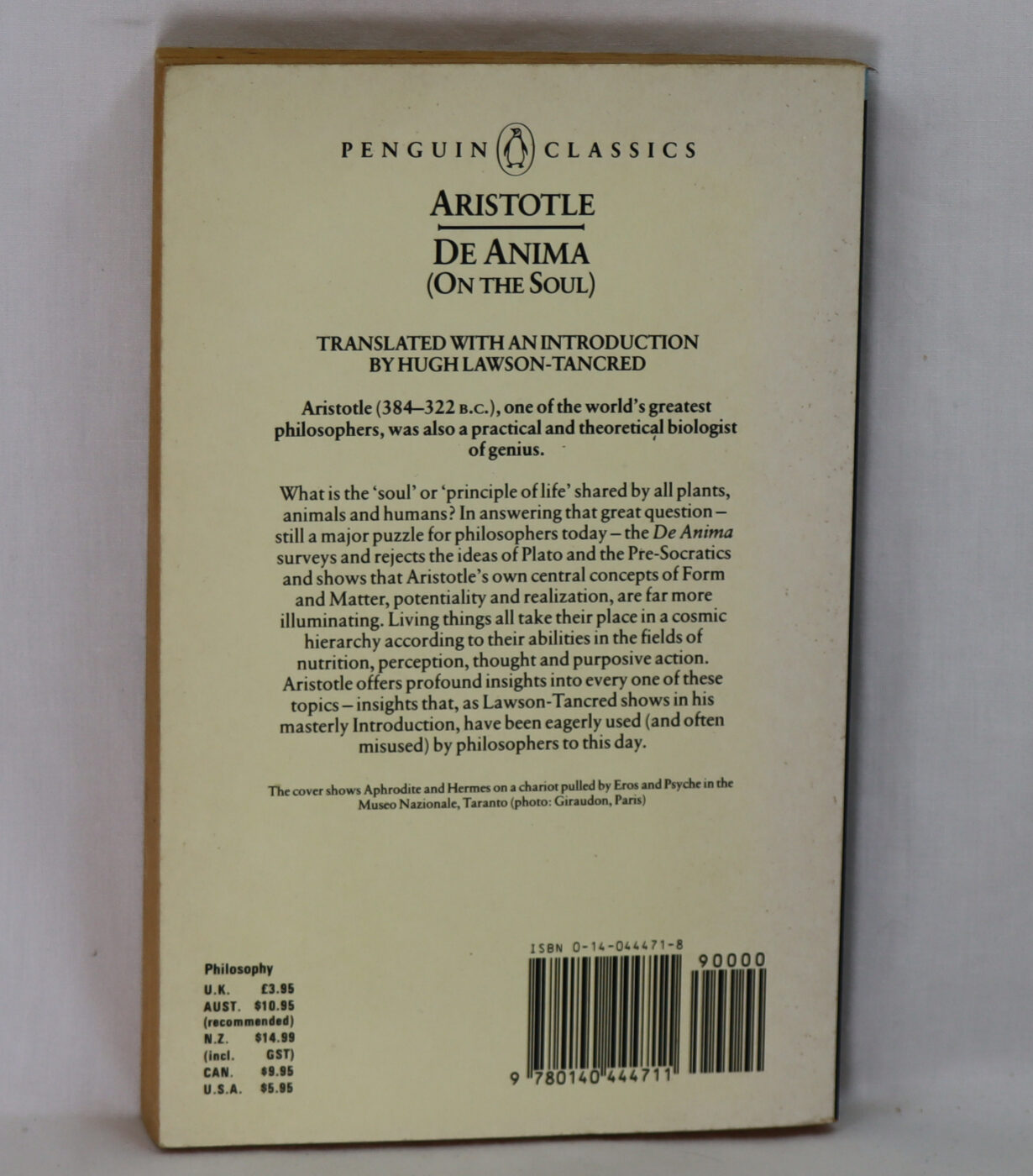 For the Pre-Socratic philosophers the soul was the source of movement and sensation, while for Plato it was the seat of being, metaphysically distinct from the body that it was forced temporarily to inhabit. Plato’s student Aristotle was determined to test the truth of both these beliefs against the emerging sciences of logic and biology. His examination of the huge variety of living organisms – the enormous range of their behaviour, their powers and their perceptual sophistication – convinced him of the inadequacy both of a materialist reduction and of a Platonic sublimation of the soul. In De Anima, he sought to set out his theory of the soul as the ultimate reality of embodied form and produced both a masterpiece of philosophical insight and a psychology of perennially fascinating subtlety.