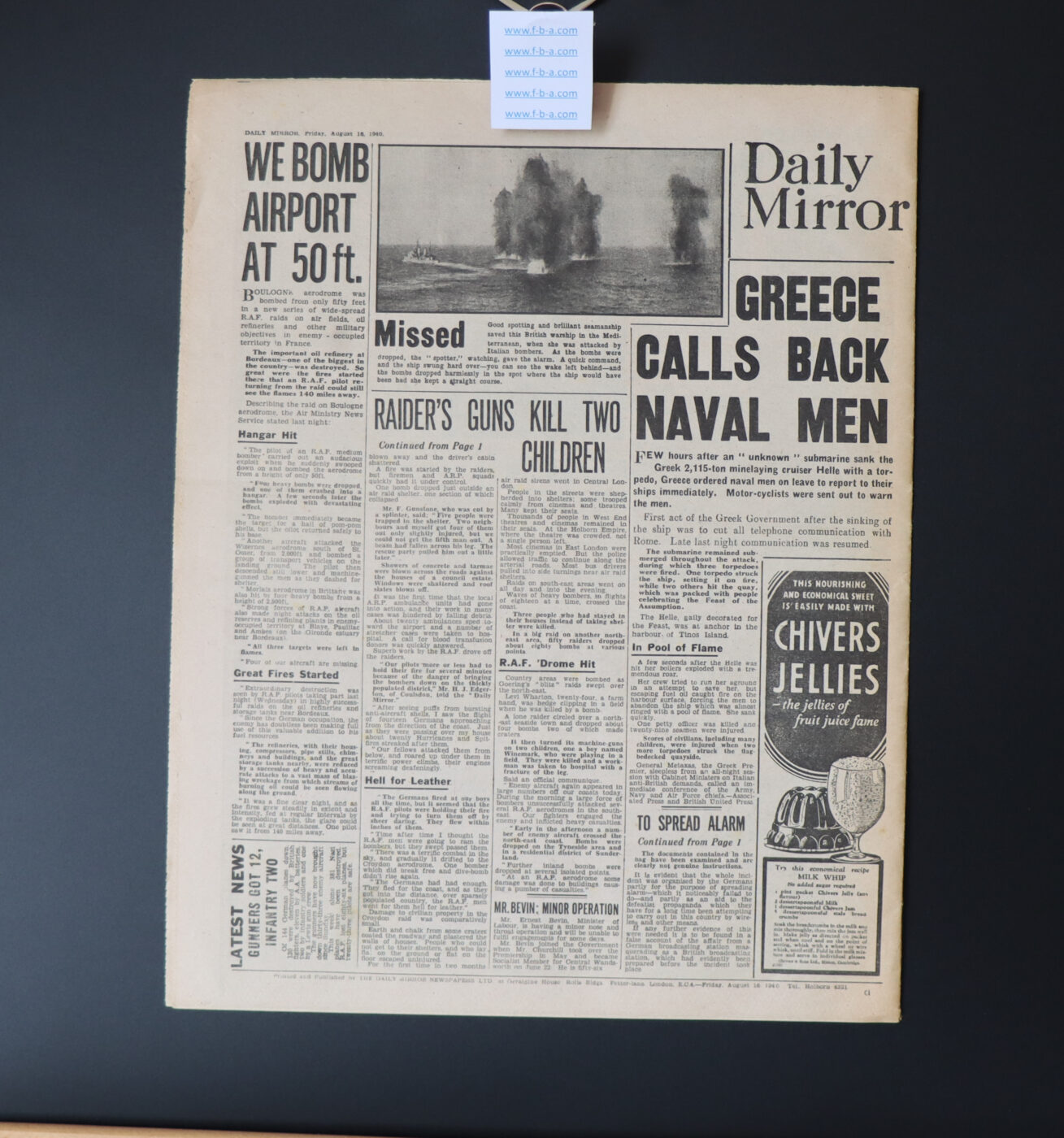 BATTLE OF BRITAIN (144 out of 1,000) WORLD WAR II. DAILY MIRROR Friday August 16th 1940
