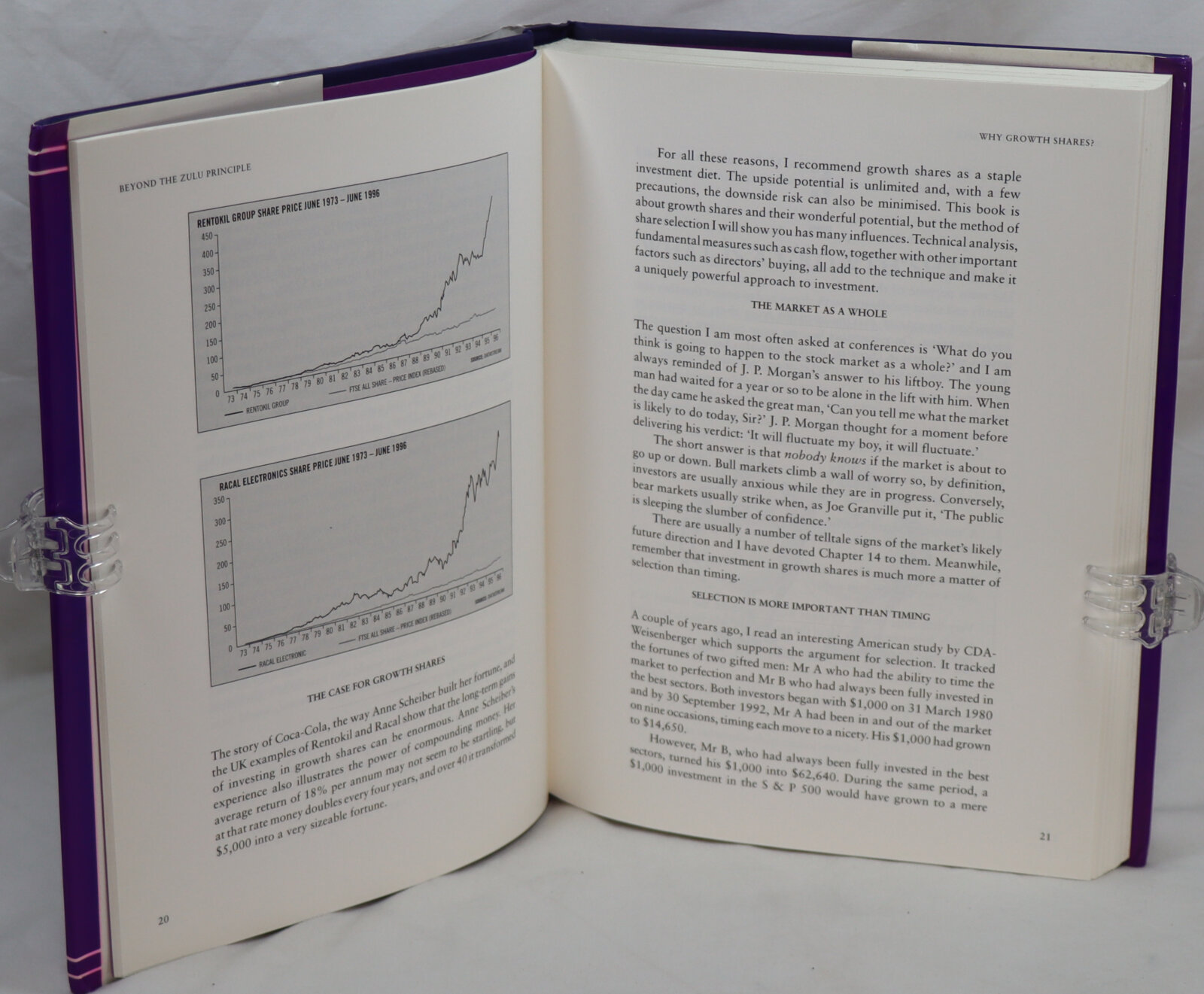 Slater draws an early distinction between “value” and “growth” investing, but the true underlying contest is between growth investing and the “Efficient Market” hypothesis that holds that “everything that is known about a company” is reflected in the share price. The fulcrum of the argument is that there are growth shares that are underpriced because the market has not yet absorbed available information and consensus forecasts. Beyond the Zulu Principle is dedicated to elucidating and applying the tests for determining whether a growth share has further to run. Much of this book makes compelling and seductive reading although after the initial euphoria, the doubts began to intrude–particularly regarding the theoretical underpinning of the crucial PEG factor–the ratio of the prospective P/E and estimated growth in EPS–which, unlike its constituents, seems to be an arbitrary ratio and does not appear to measure anything. Likewise, some of the author’s arithmetic has an engaging seat-of-the-pants frisson.