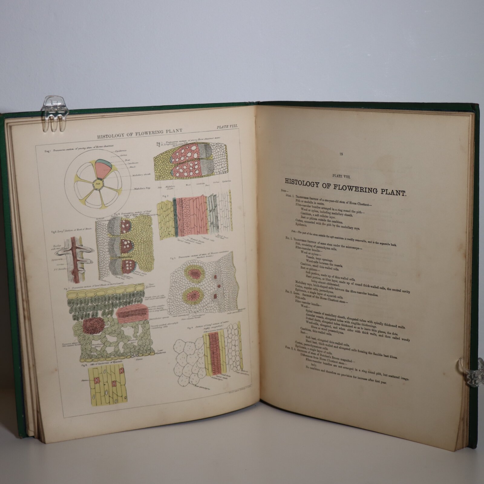 ‘A GUIDE TO THE PRACTICAL STUDY OF PLANTS AND ANIMALS’ Adapted to the requirements of the London University, Science and Art Department, and for use in Schools and Colleges With Accompanying Text containing arrangement and explanation, equivalent terms, glossary and classification Second edition (fifth thousand). Original cloth backed boards with a imprint of a toadstool on the front board. 49 pages of descriptive text accompanying the 24 colour plates, which show various aspects of dissection. A very clean example of a much under-rated book. Contents clean and tight. A near Fine copy. Subjects of the plates include yeast and bacteria, brown and green moulds, protococcus and chara, bracken fern, flowering plant, amoeba, blood corpuscles, vorticella, hydra, earthworm, fresh-water mussel, lobster, snail, and frog.