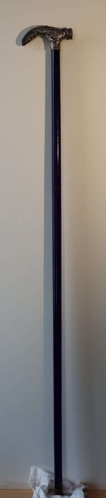 Silver embossed handle on a blue glass shaft. with a brass end ferrule.
