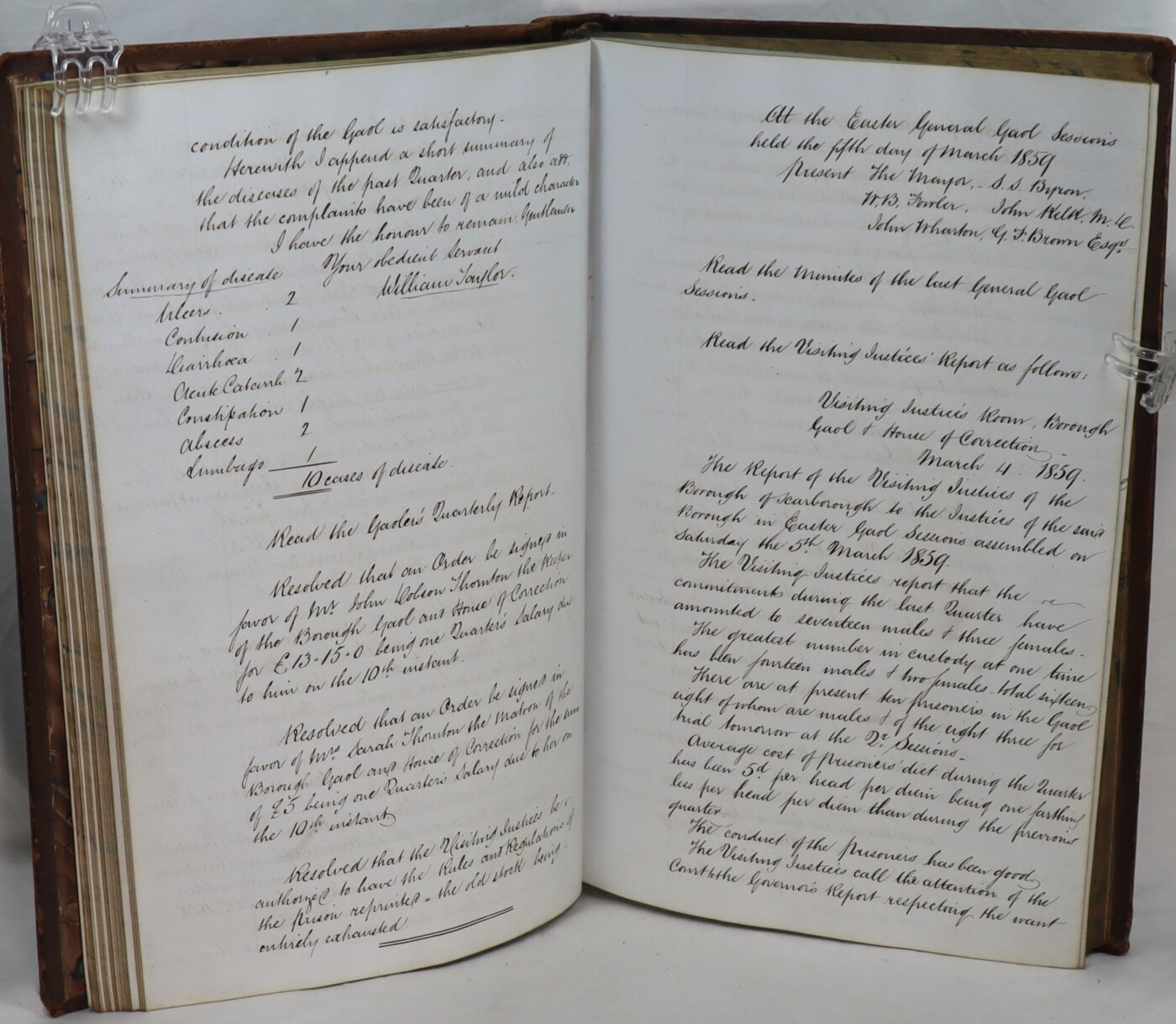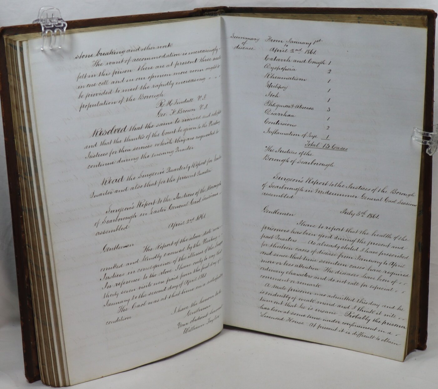 Read the Surgeon’s Annual Report as follows: Surgeon’s Report to the Justices of the Borough of Scarborough, in Michaelmas Gaol Sessions assembled on Tuesday the 26th day of September 1854.