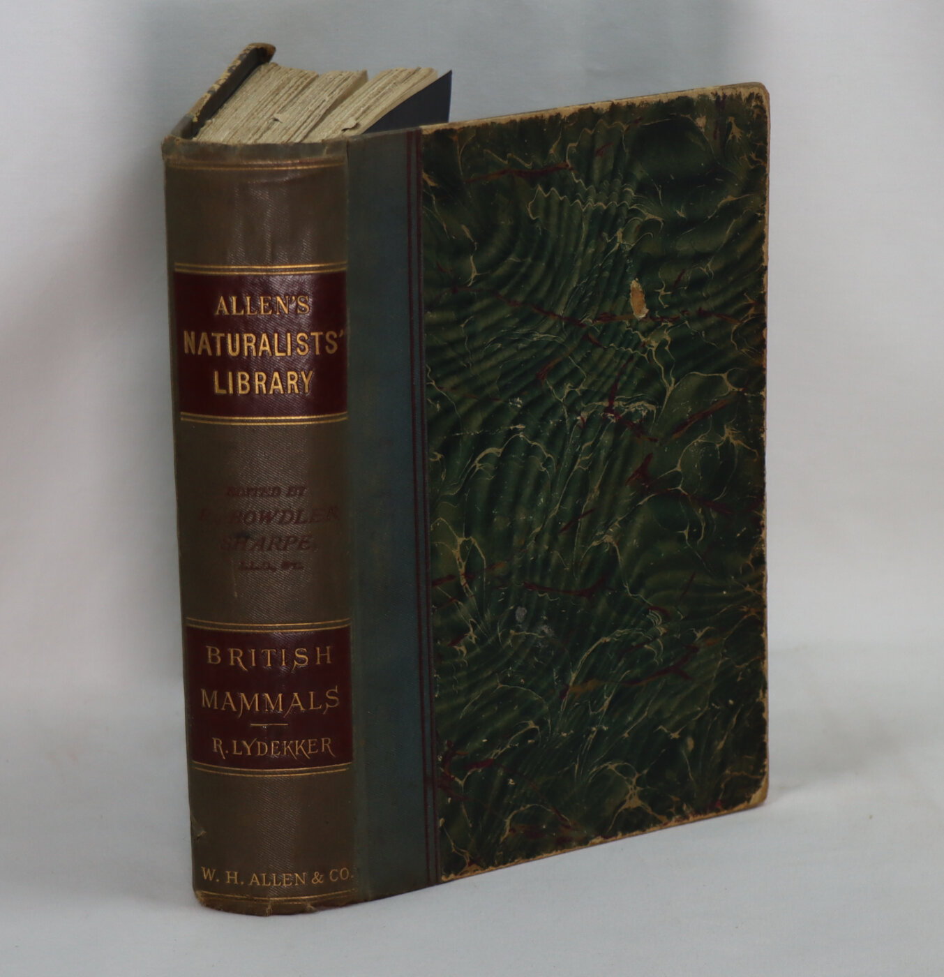 Green cloth spine with maroon title plates and gilt title. Green marbled boards.