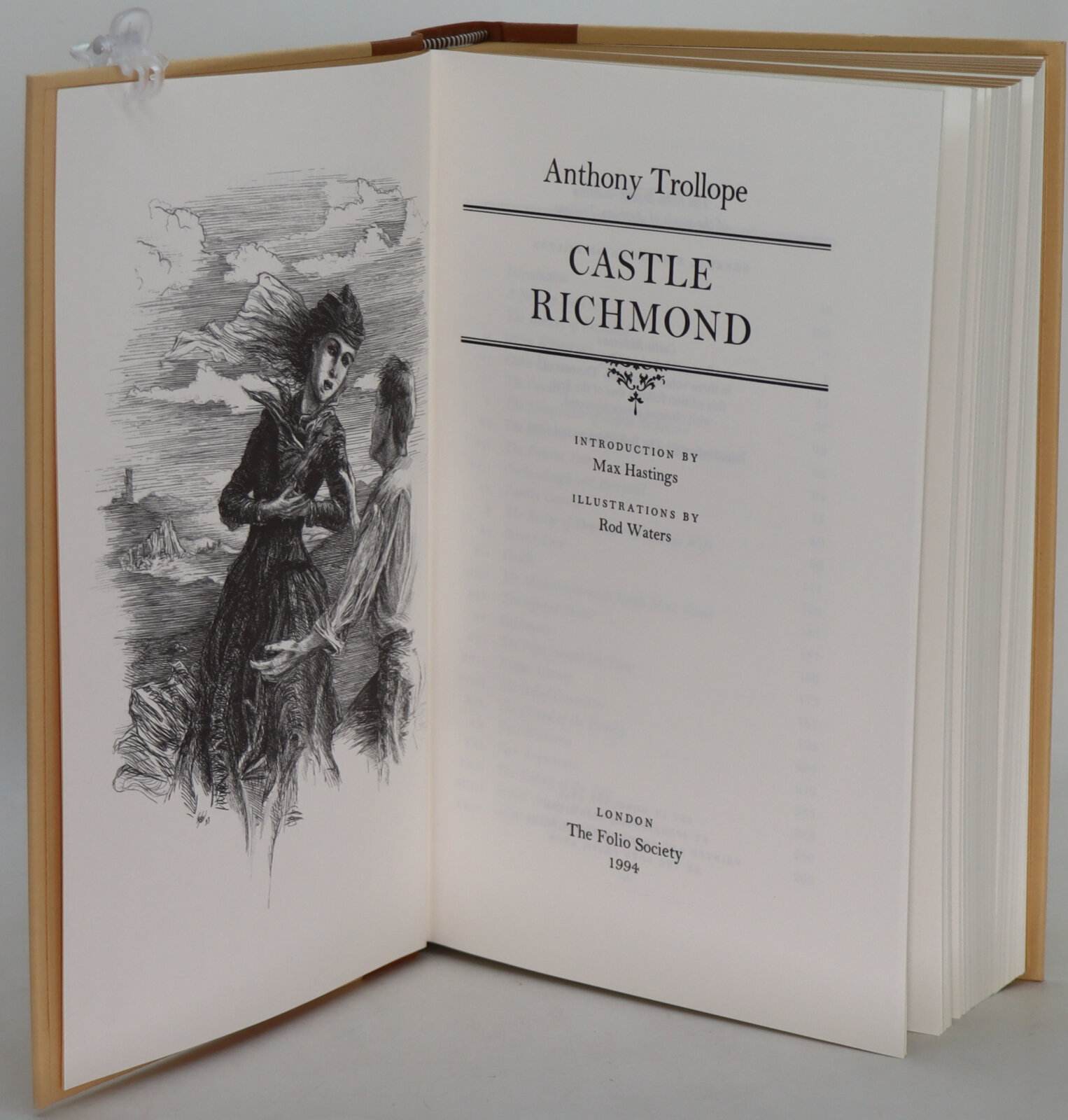 Tan cloth spine with black title plates and gilt lettering. Cream boards with floral edging.
