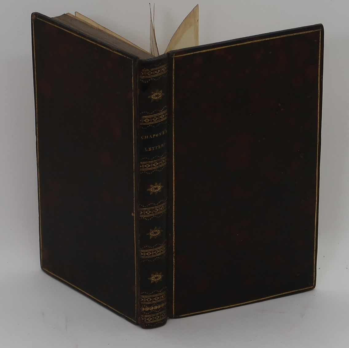 Brown mottled calf with black title plate, gilt banding, decoration and lettering on the spine. Gilt edge line on both boards.