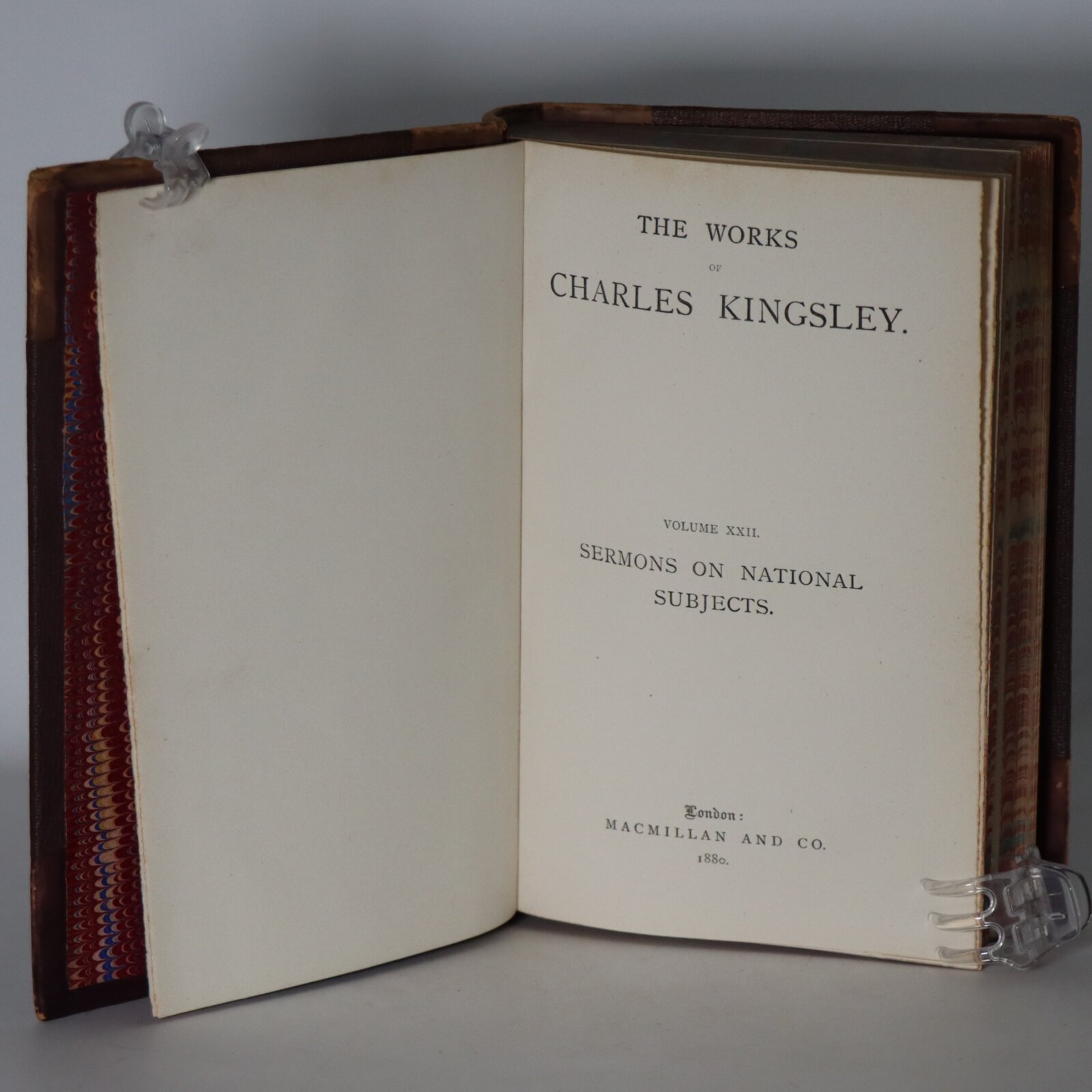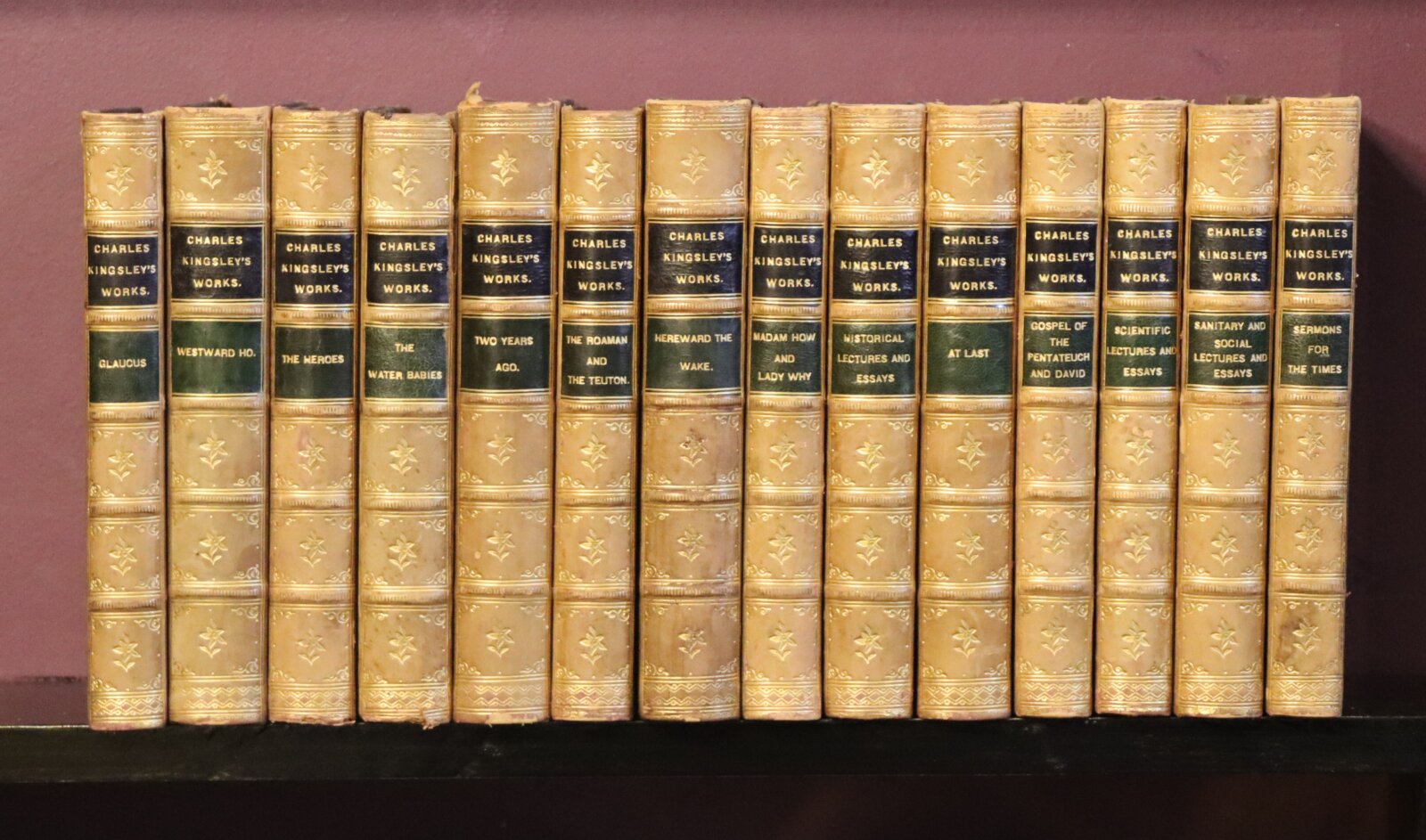 Individual book titles are – Poems; Yeast; Alton Locke; Hypatia; Glaucus; Westward Ho; The Heroes; Two Years Ago; The Water Babies; The Roman and the Tuton; Herward the Wake; Village Sermons and Town and Country Sermons; The Hermits; Madam How and Lady Why; At Last; Prose Idylls; Plays and Puritans; Historical Lectures and Essays; Sanitary and Social Lectures and Essays; Scientific Lectures and Essays; Literary and General Lectures and Essays; Sermons on National Subjects; The Good News of God; The Water of Life; Gospel of the Pentateuch and David; Discipline; Westminster Sermons.
