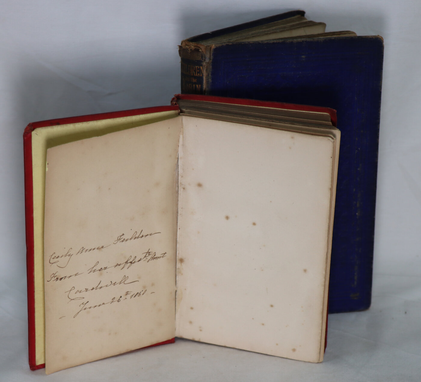 A scarce anonymous collection of mid-nineteenth century children’s stories with a hand-coloured frontispiece. Bound in cloth with gilt lettering. Stories included in this book are: ‘The children and the Robin’ ‘Story of Harriet Gray’ ‘The Honeysuckle and the Bird’s Nest’ ‘The Basket of Peaches’ ‘Great Things from Little Things Do Grow’. In a cloth binding. Externally, worn to extremities with bumping. Tidemark to boards. Pages age toned.