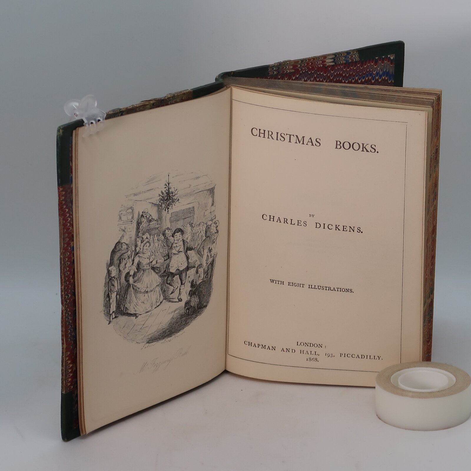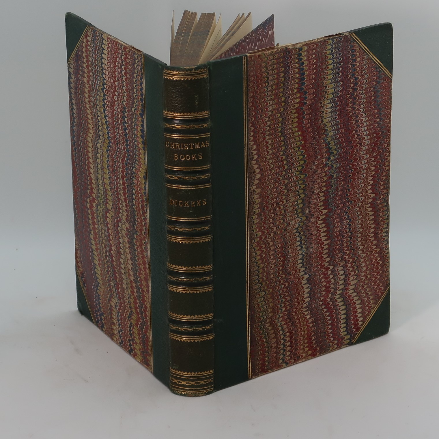 Green leather spine with gilt banding and title. Red and green marbled boards. A very fine edition