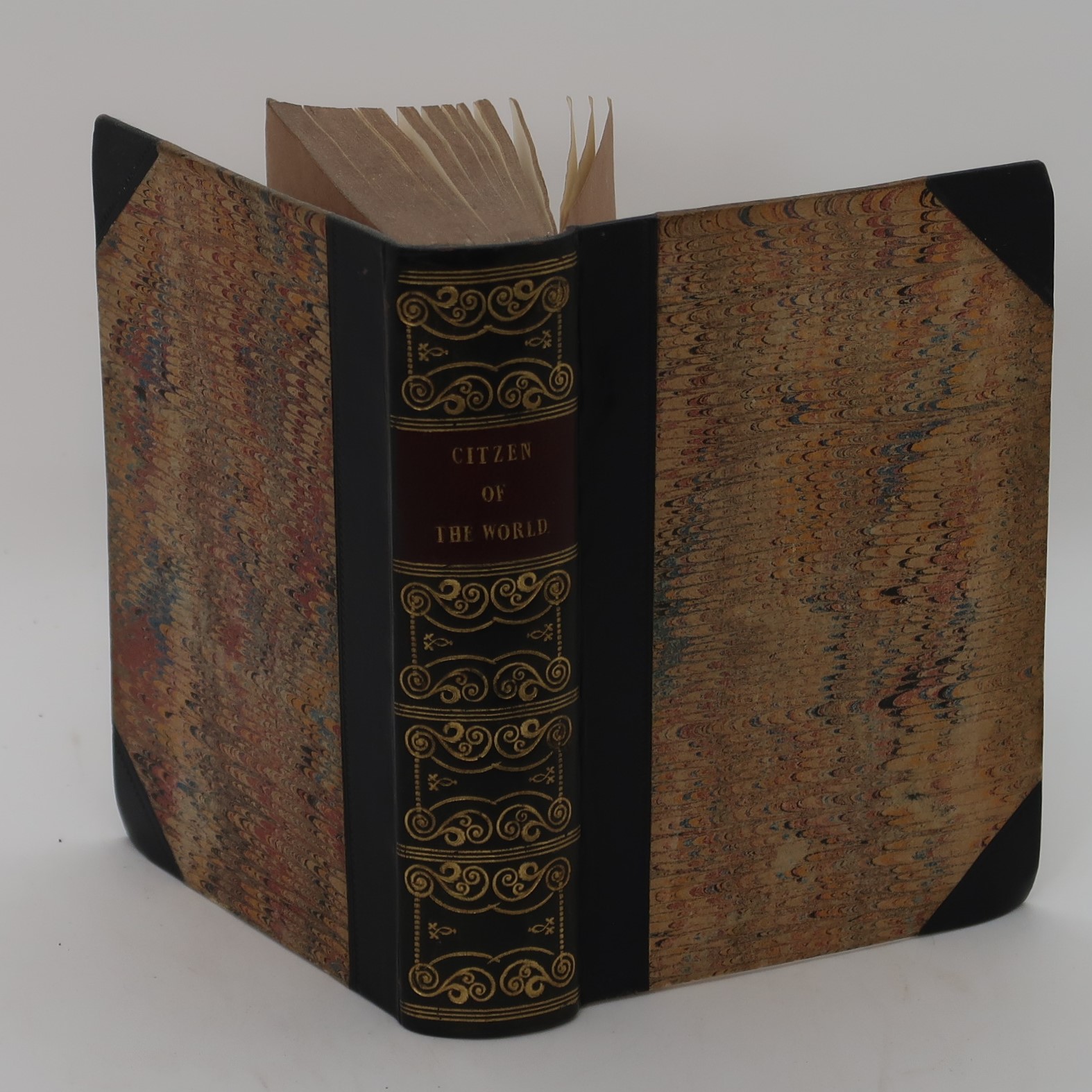 Navy leather spine with maroon title plate, gilt decoration and lettering. Tan marbled boards.