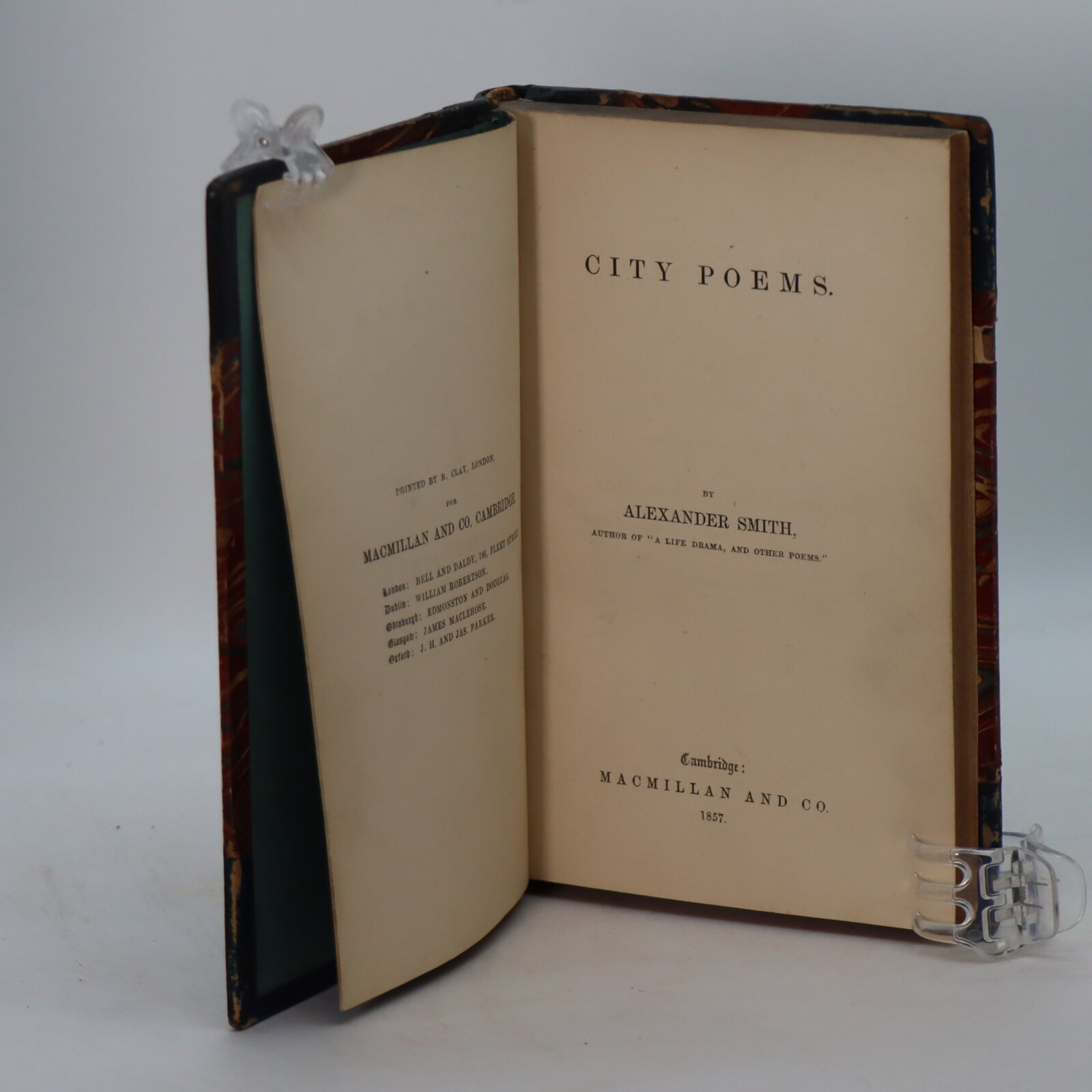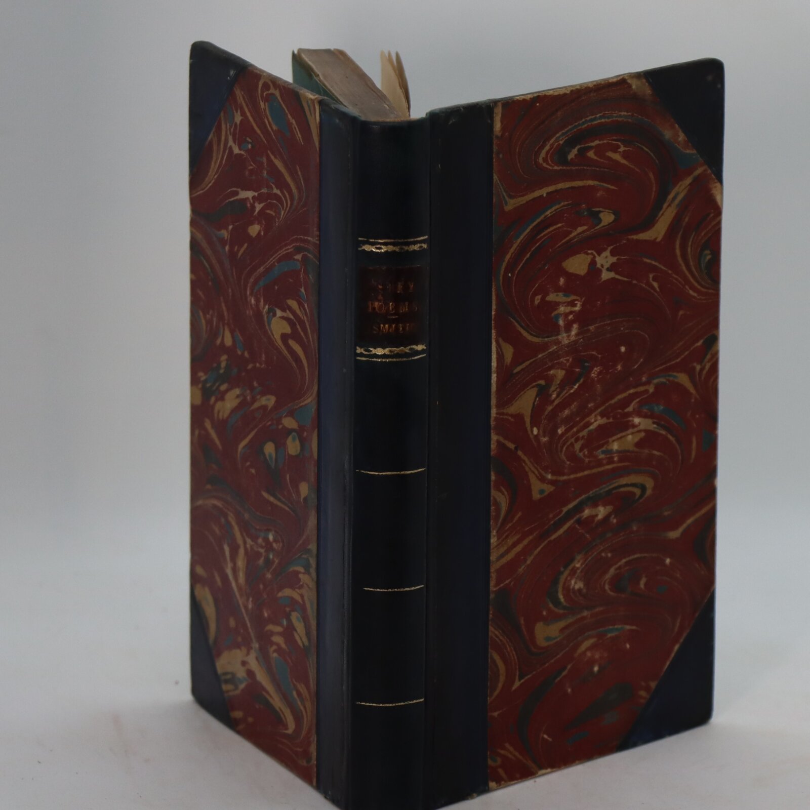Navy calf spine with red marbled boards. Black title plate with gilt lettering and banding.