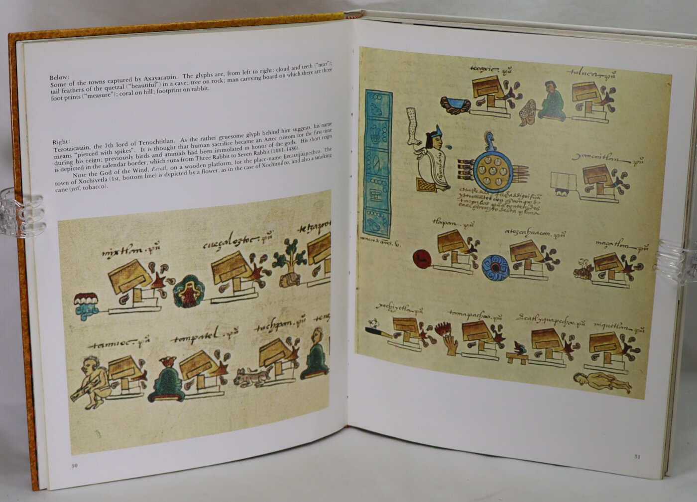 Glossy cream board binding with Aztec painting and title on the front board.