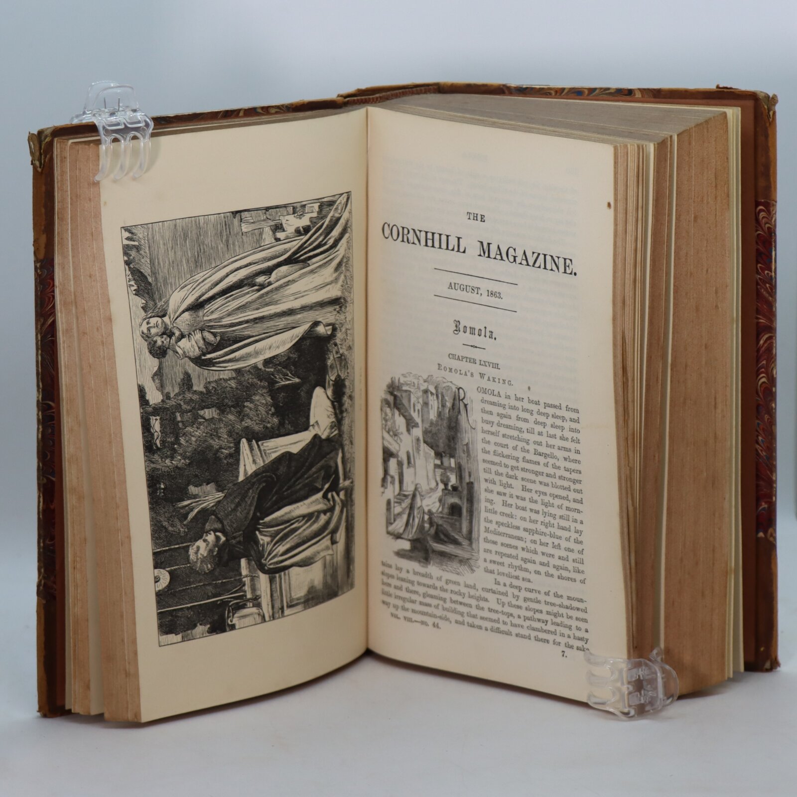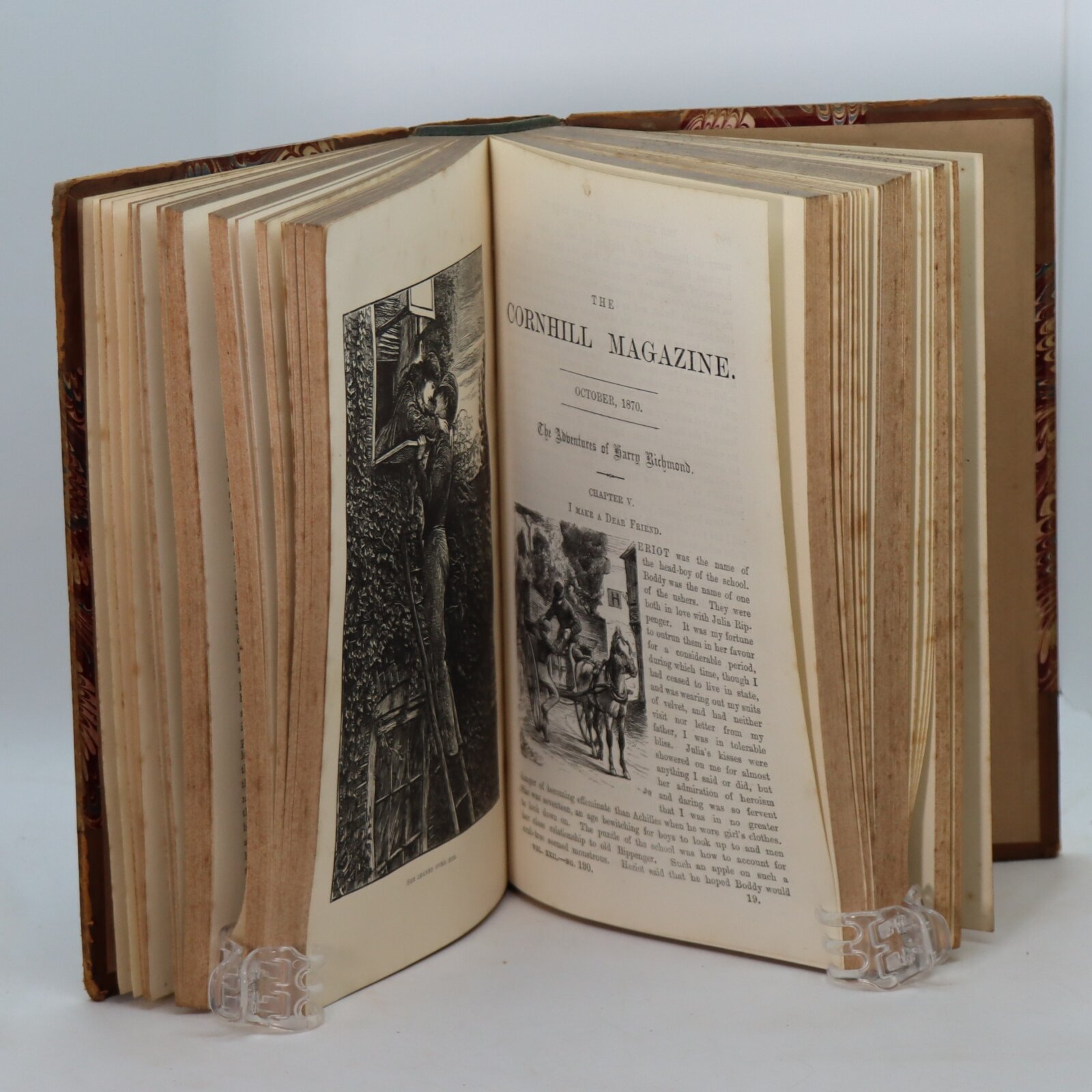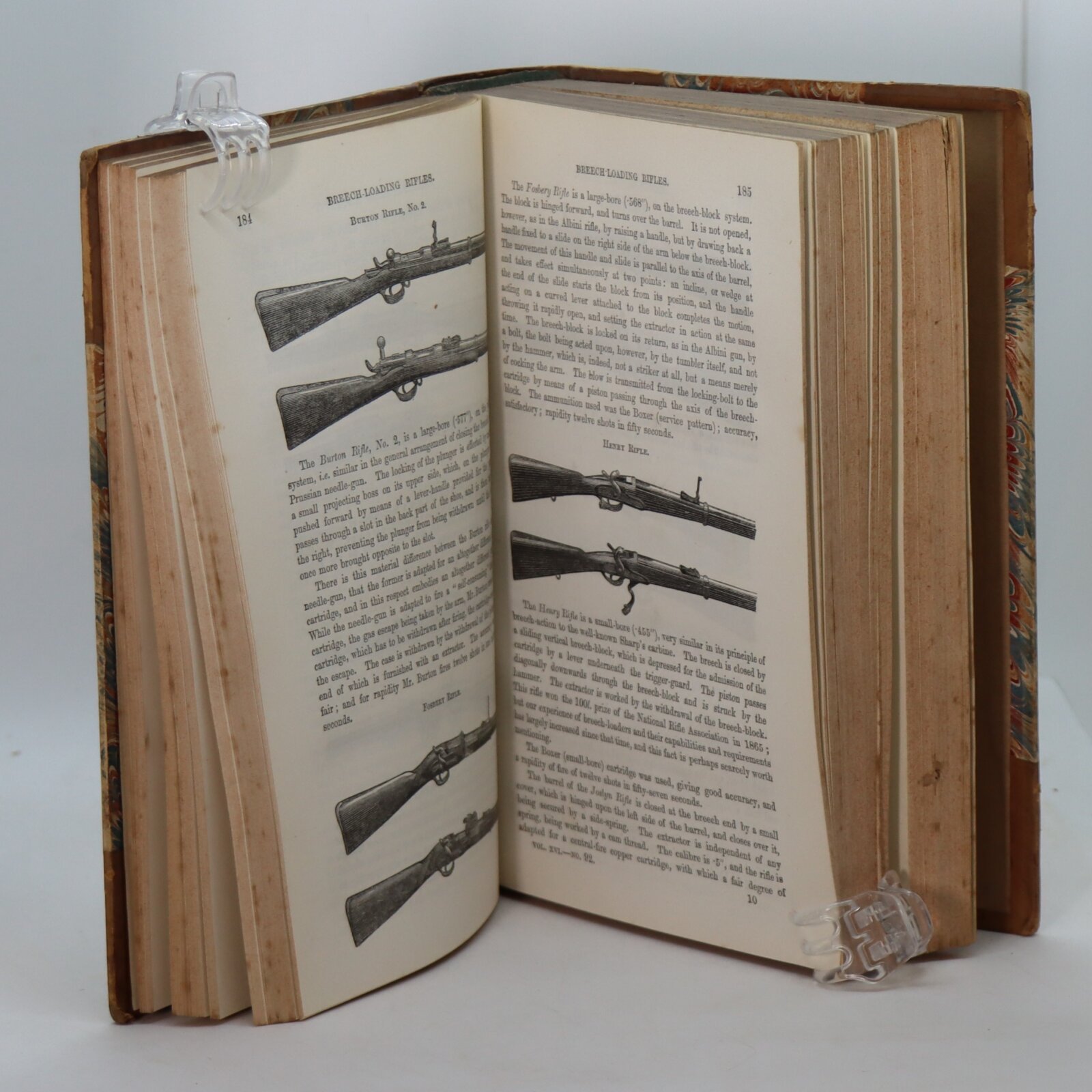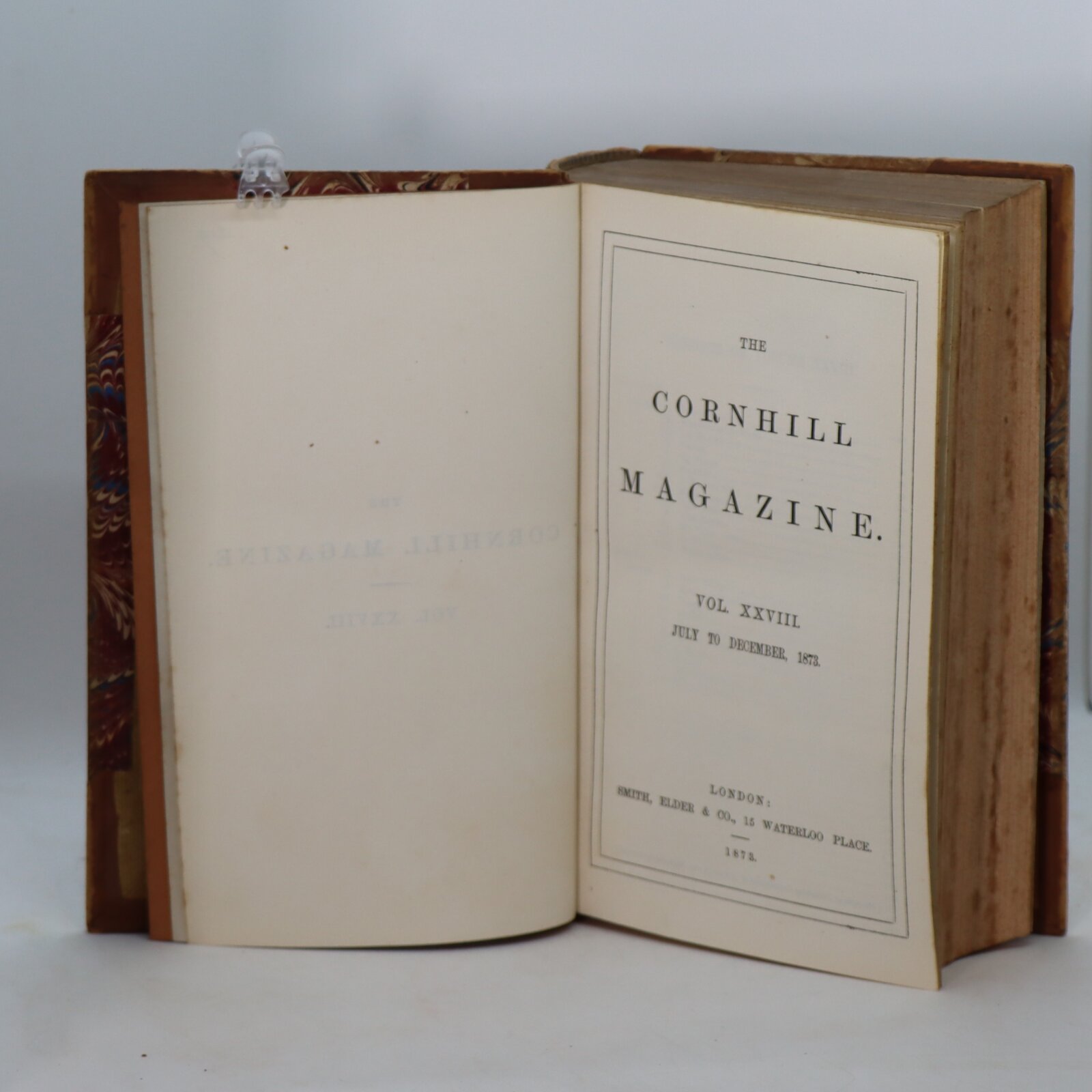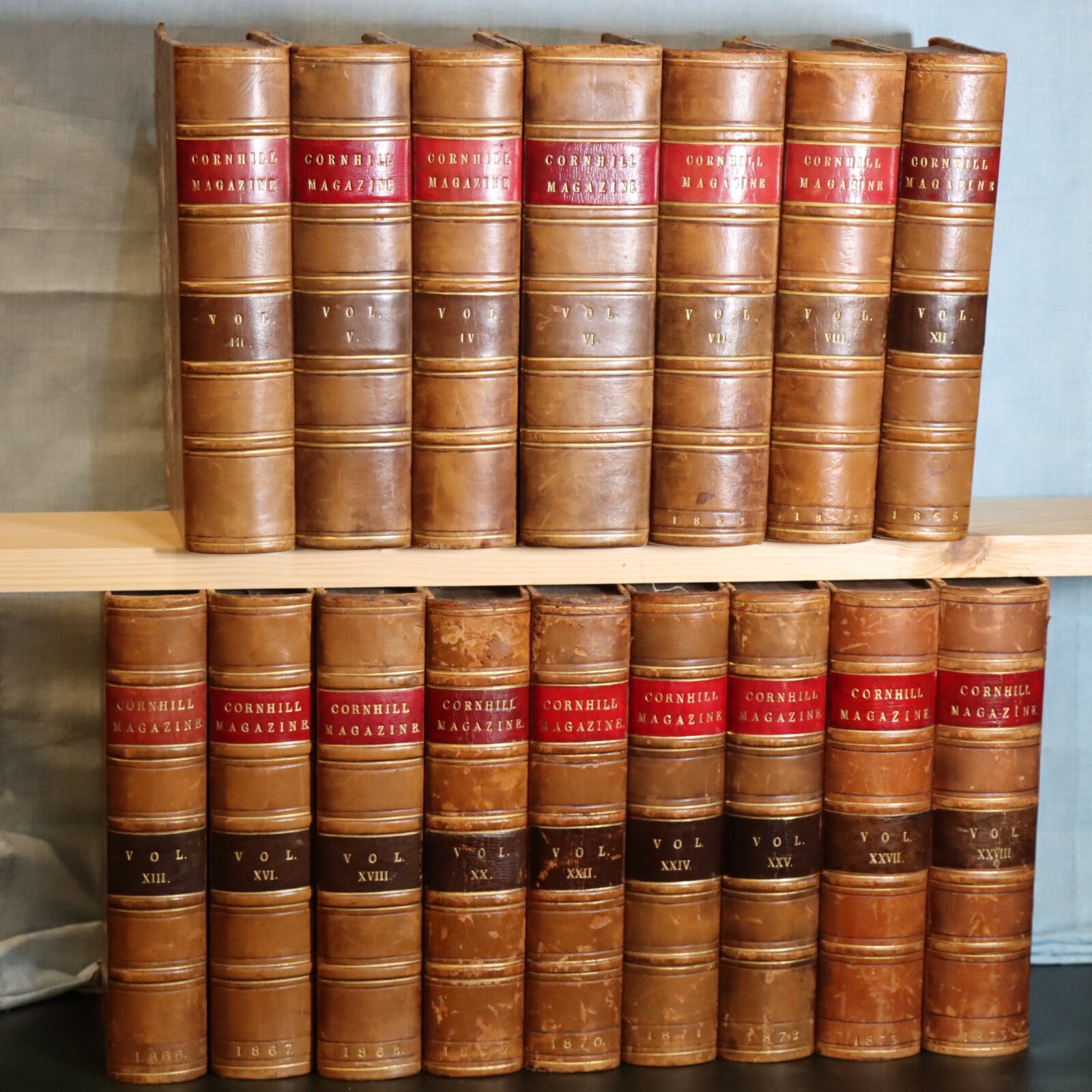 Volumes III, IV, V, VI, VII, VIII, XII, XIII, XVI, XVIII, XX, XXII, XXIV, XXV, XXVII & XXVIII. Tan leather spine and corners, red marbled boards. Red and light brown title plates with gilt lettering and banding. One volume has an 1878 bookmark inside (advertisement for Brown & Polson’s flour).