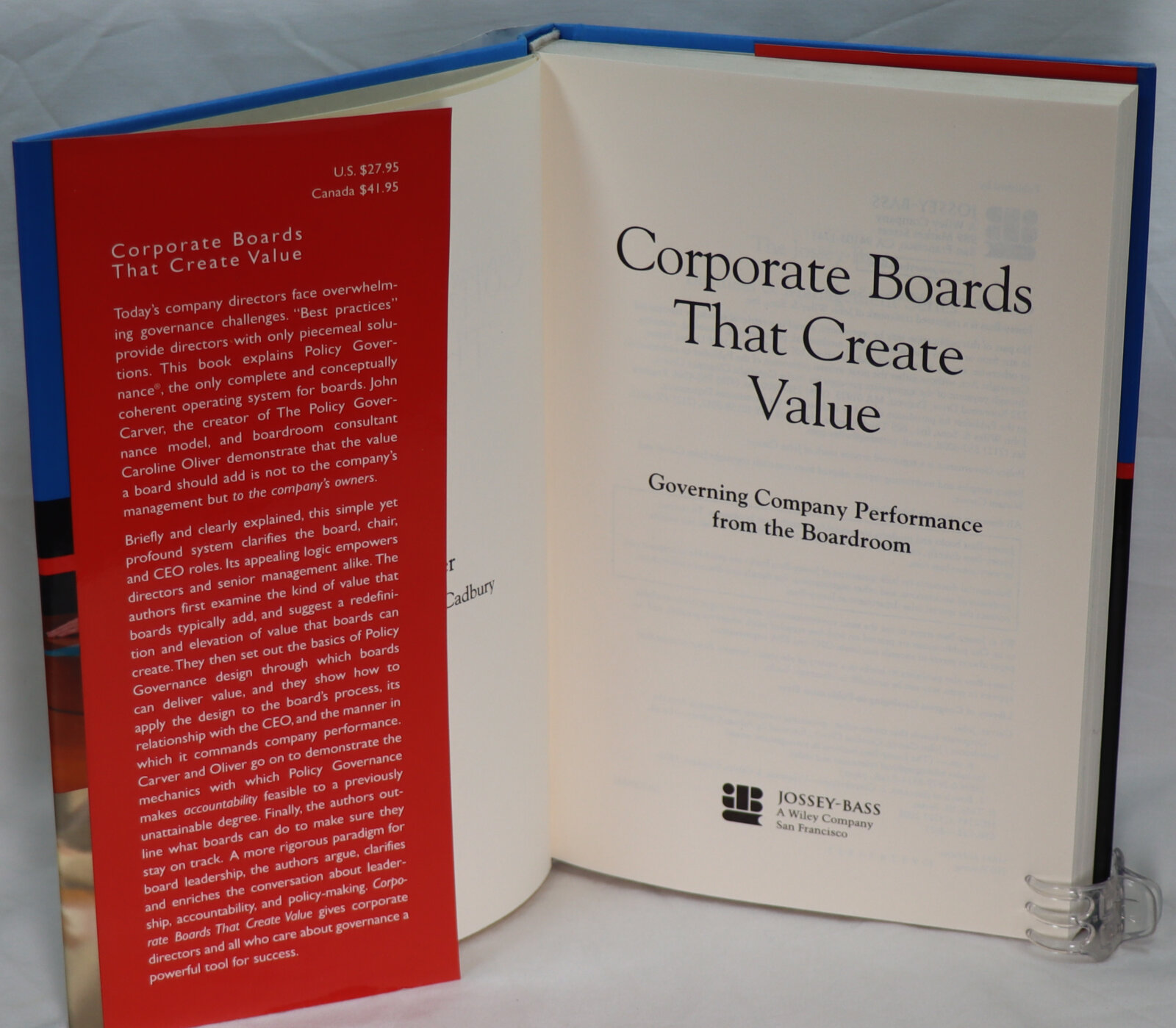 • “In Corporate Boards That Create Value, Carver and Oliver offer totally new insights into an old topic. This rare and remarkable book provides a logical framework for governing in an efficient, accountable manner. The authors’ easily understood and brilliantly explained methodology shows how directors can provide complete accountability to shareholders and also empower the management of the enterprise.” –James Gillies, Ph. D., Professor Emeritus, Schulich School of Business, York University, Toronto, and author of Boardroom Renaissance: Power, Morality and Performance in the Modern Corporation