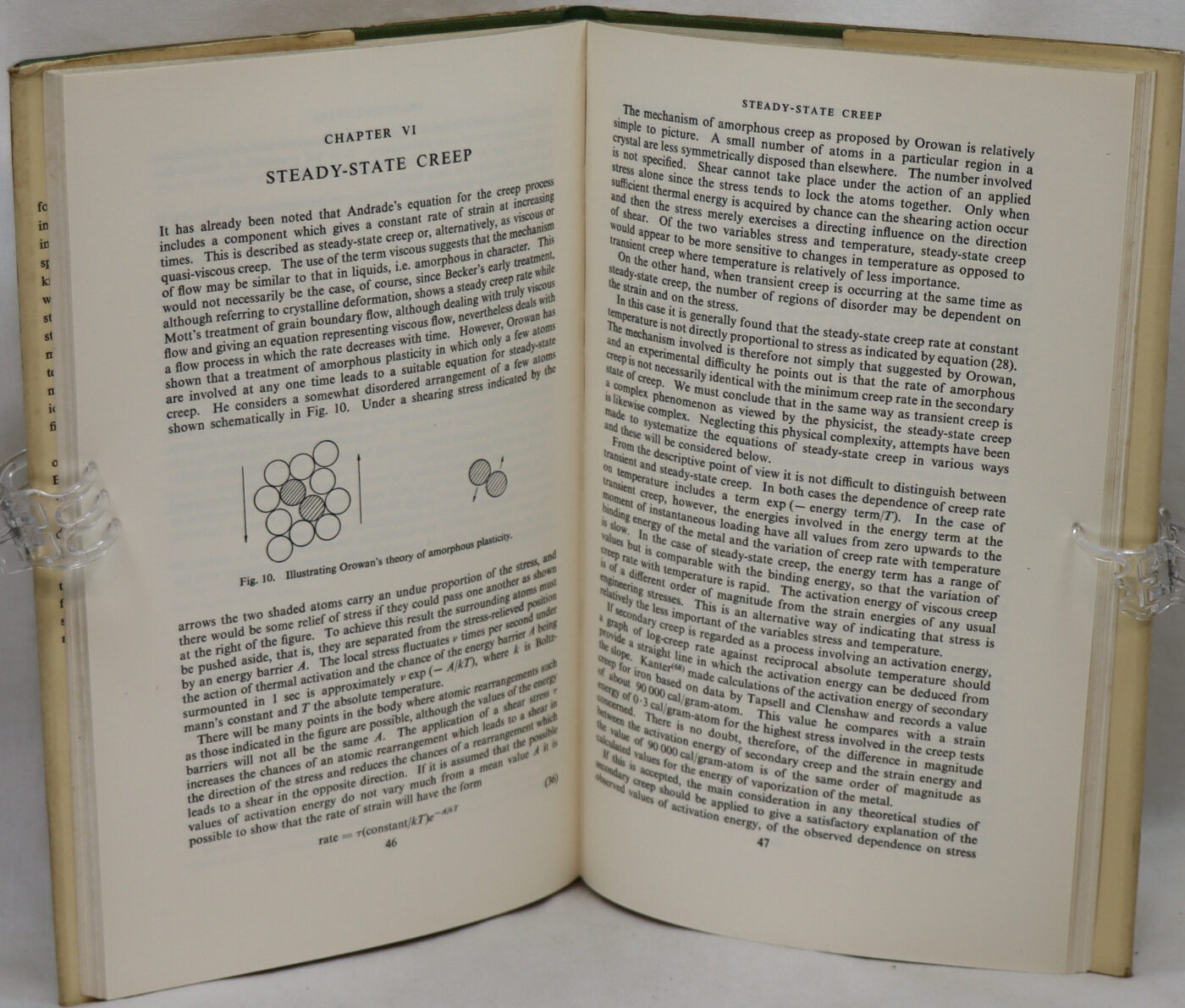 London: Institute of Physics, 1951 Full pale green cloth, 80 pages, 24 figures, references, index. Torn spine repaired with acid-free PVA, company library markings, covers unevenly sunned, lacks ffep. Contents: characteristics of the creep curve; crystalline flow; metallographic features of creep; grain boundary creep; transient creep; steady-state creep; tertiary creep; development of creep-resistant alloys.