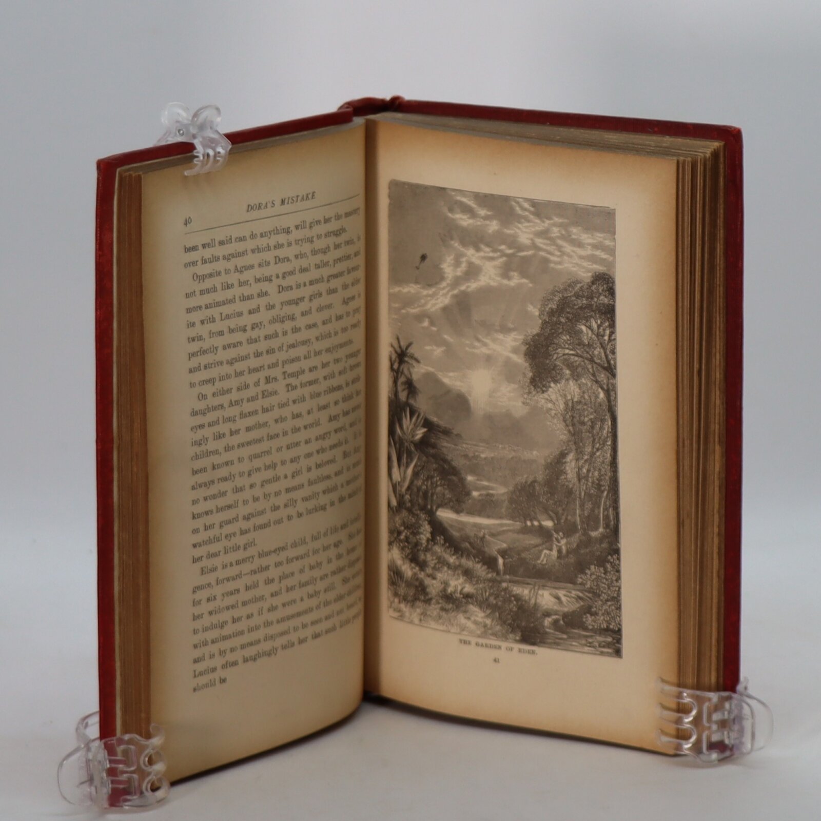 Red cloth binding with gilt title on the front board. Gilt title and floral decoration on the spine.