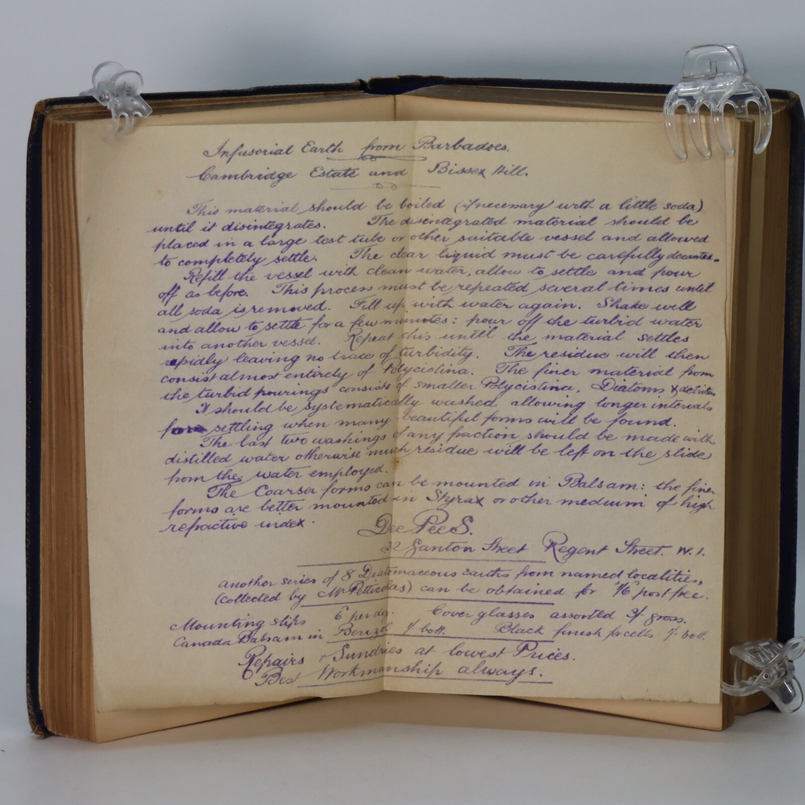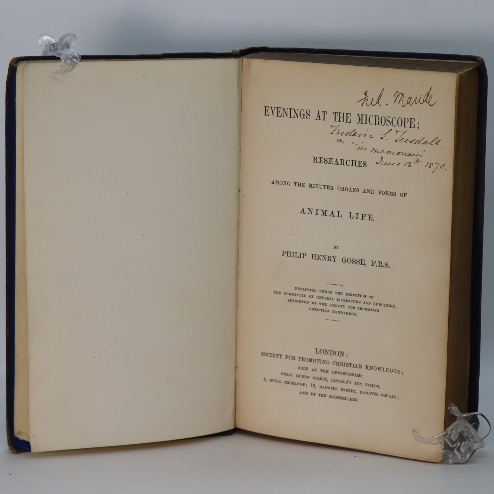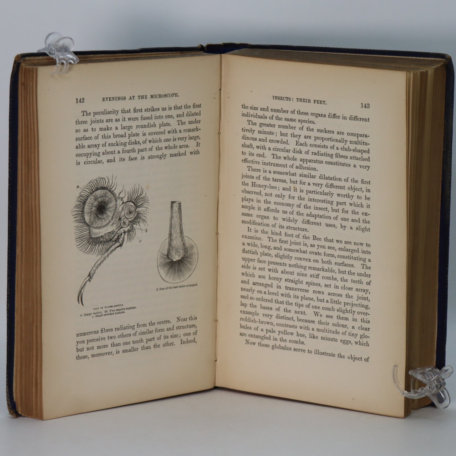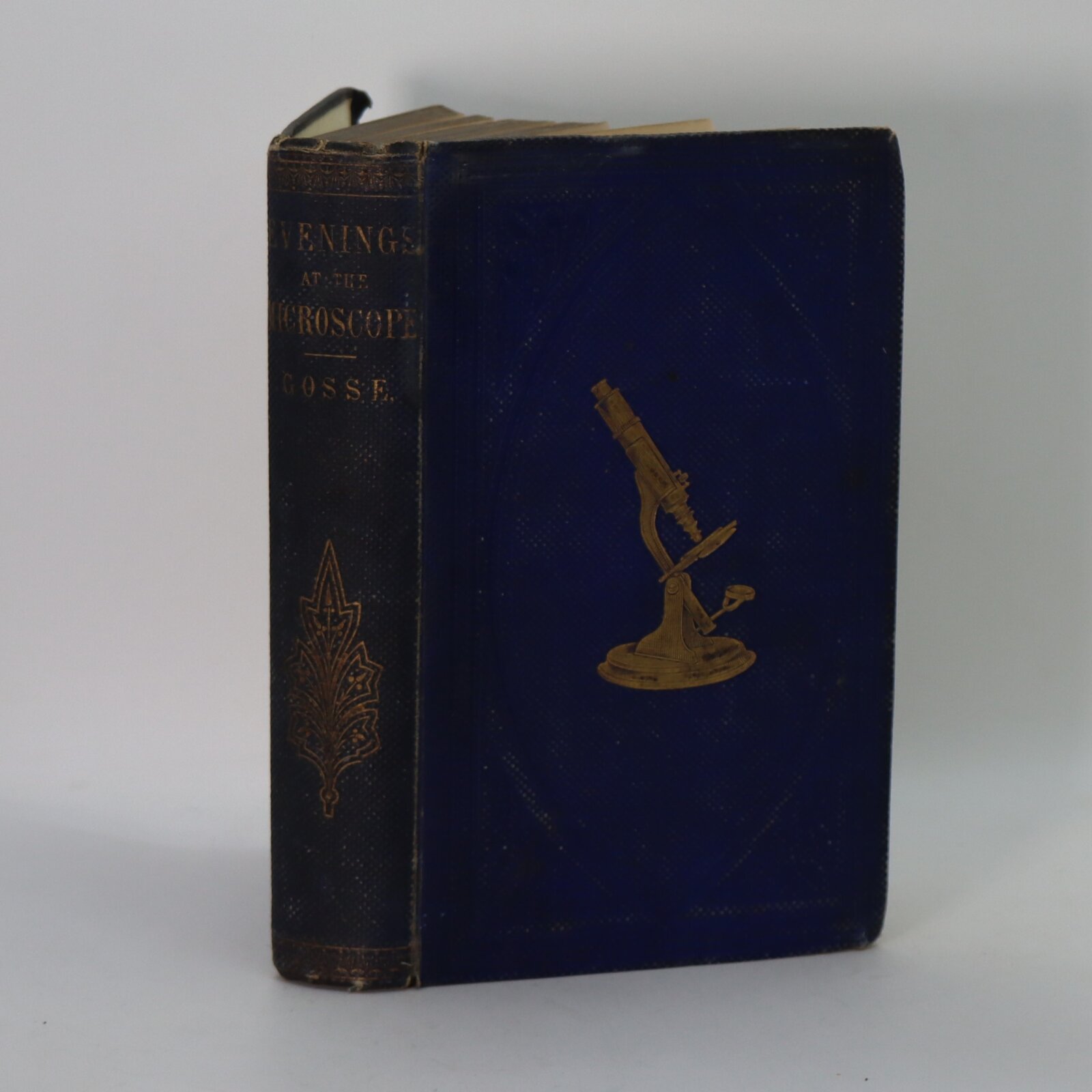 Green cloth binding with gilt title on the spine and gilt microscope on the front board.