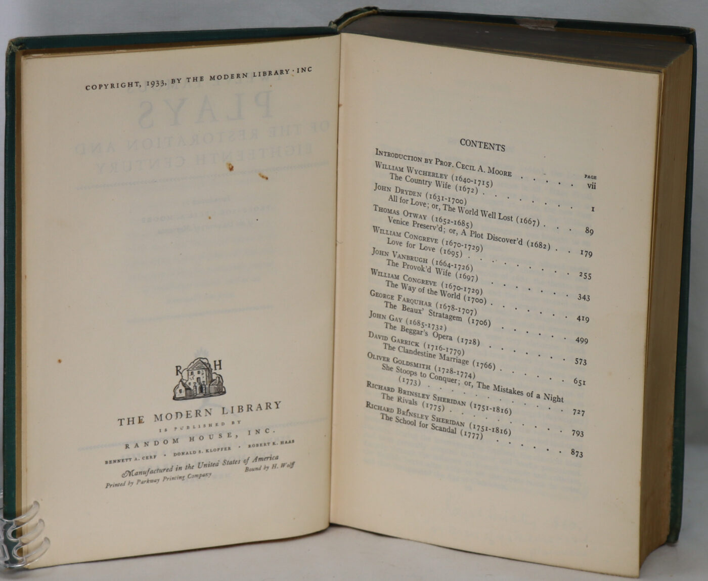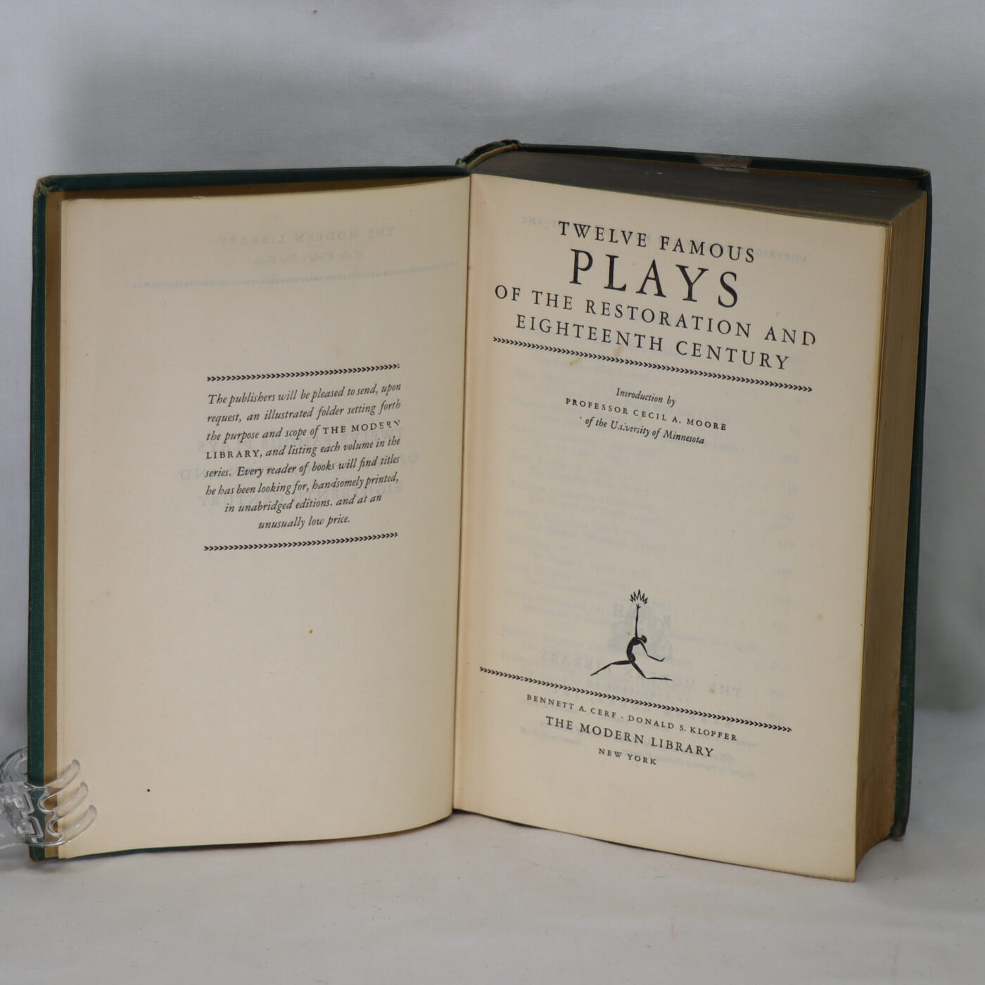 1st Edition. 952 pages Includes: The Country Wife; All for Love; or, The World Well Lost; Venice Preserv’d; or, A Plot Discover’d; Love for Love; The Provok’d Wife; The Way of the World; The Beaux’ Stratagem; The Beggar’s Opera; The Clandestine Marriage; She Stoops to Conquer; or, The Mistakes of a Night; The Rivals; The School for Scandal.