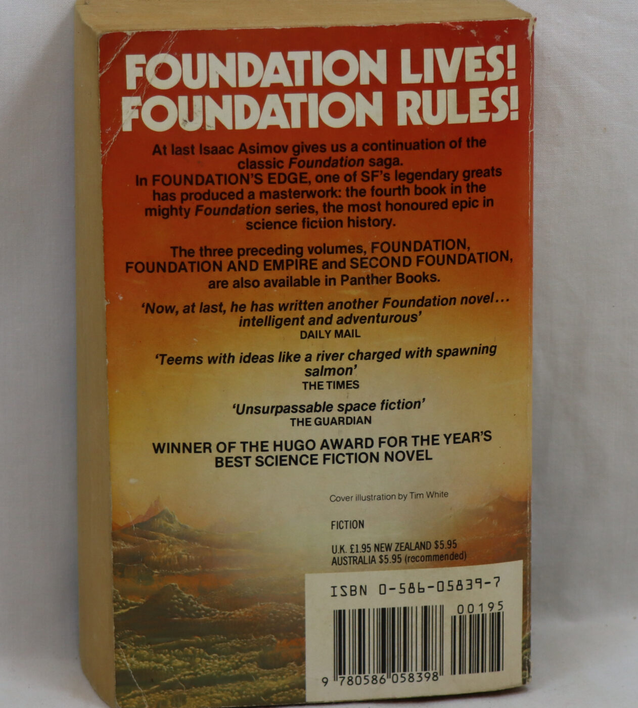 Please view the photographs for book details. Foundation’s Edge (1982) is a science fiction novel by American writer Isaac Asimov, the fourth book in the Foundation Series. It was written more than thirty years after the stories of the original Foundation trilogy, due to years of pressure by fans and editors on Asimov to write another, and, according to Asimov himself, the amount of the payment offered by the publisher. It was his first novel to ever land on The New York Times best-seller list, after 262 books and 44 years of writing.