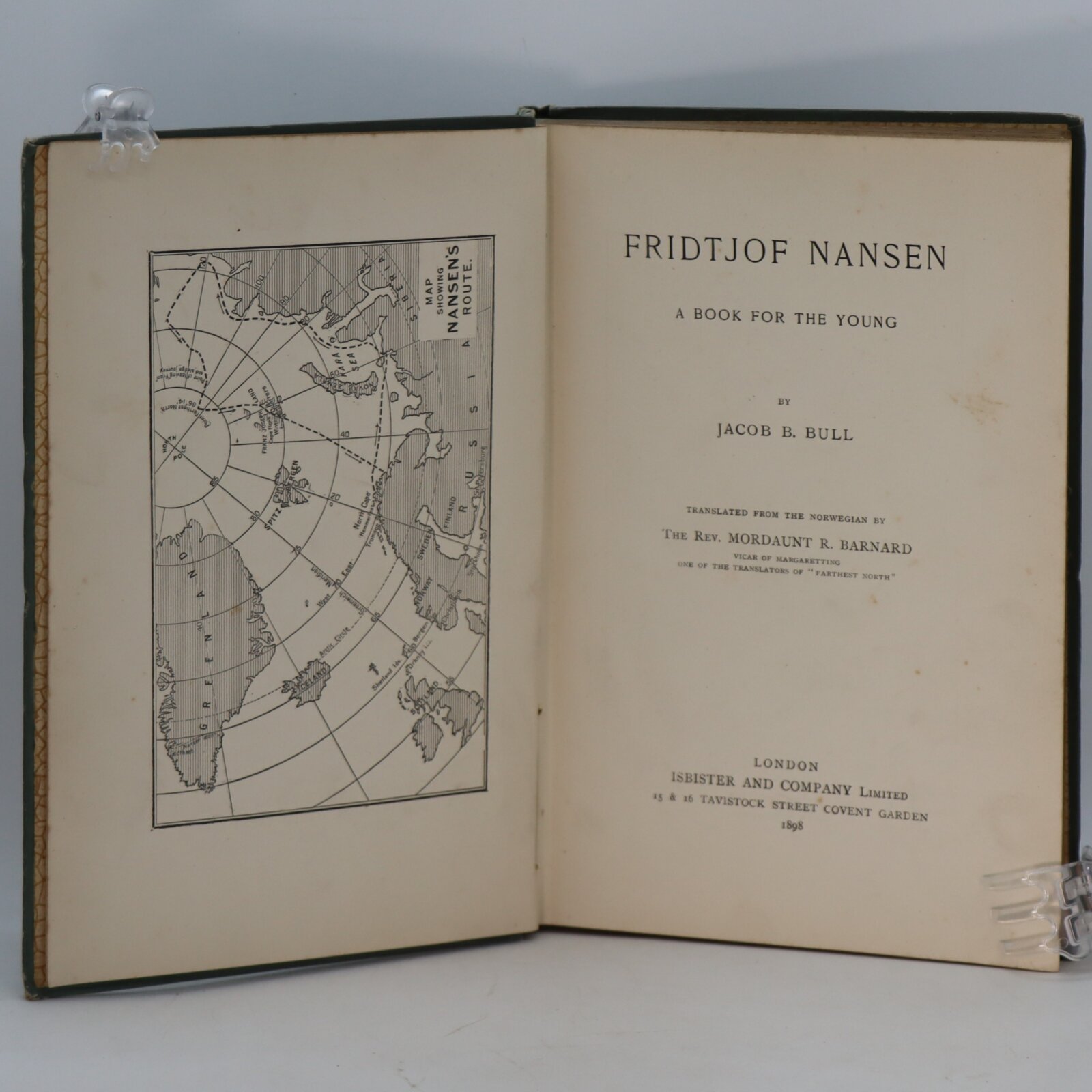 London, Isbister and Company, 1898. 8vo. Original grey pictorial cloth, embossed in gilt, printed in white and brown, bevelled edges, patterned endpapers; pp. [ii], 132, [6, publisher’s advertisements], Arctic map as frontispiece, illustrations in the text (after wood-engravings and photographs, some full-page), initially and towards the end a little spotted, ownership inscription to verso of front fly-leaf, otherwise a rather good copy of a rare item. First English edition of this early book for young readers on the childhood, upbringing, and later achievements of Nansen, beautifully produced and designed. COPAC locates copies at Cambridge, Oxford, in the National Library of Scotland, at Trinity College, Dublin and in the British Library.