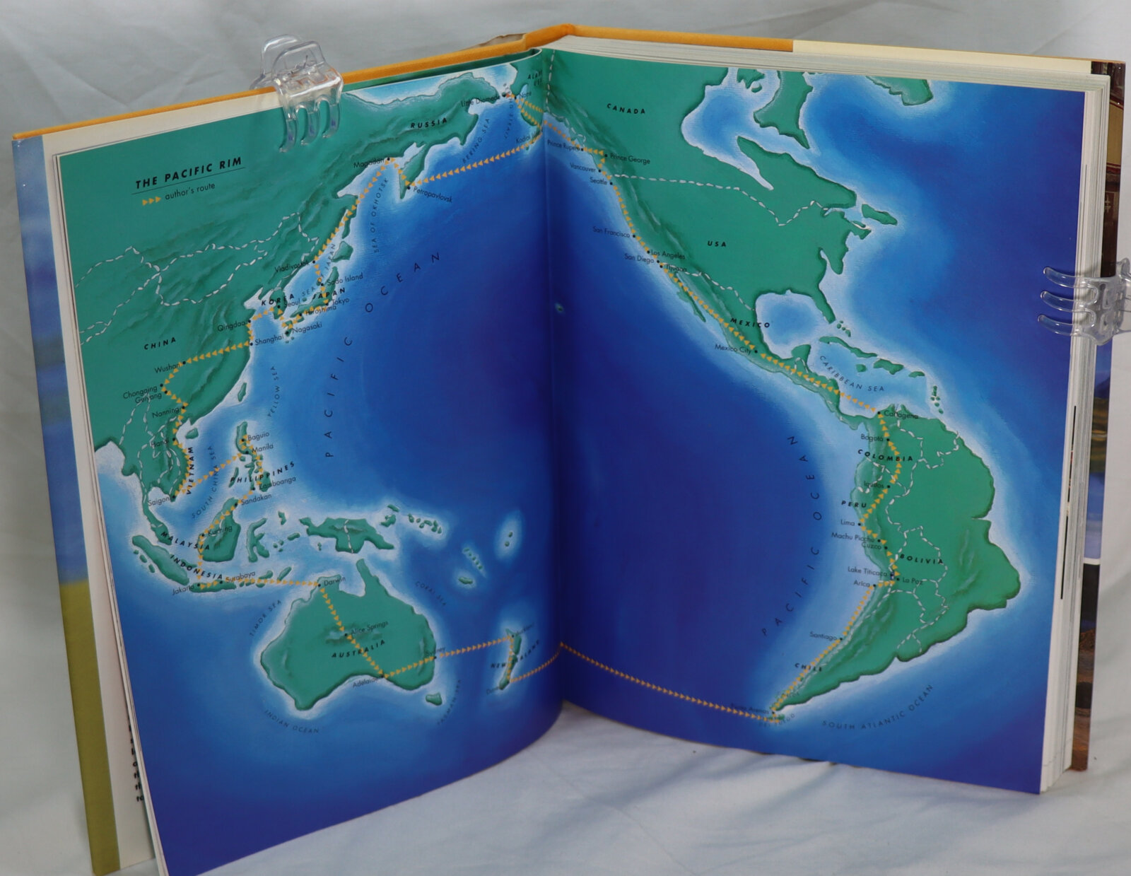 In this account of the third of Michael Palin’s travel adventures for BBC Television, he journeys for almost a year, covering 50,000 miles and all of the 18 countries that border the Pacific Ocean, encompassing a wide diversity of landscape, culture and people. The Pacific Rim is one of the world’s most volatile areas, with economies that are expanding faster than anywhere else on earth – and here the earth itself is in a constant state of flux. Not for nothing is the Pacific coastline known as the “Ring of Fire” – volcanoes mark Palin’s journey like stepping stones, and he climbs one which has recently erupted and is still smoking. He negotiates mountains and plunging gorges, crosses glaciers, dodges icebergs, follows great rivers such as the Yangtse and the Amazon, and confronts the notorious Cape Horn and the wild and windswept beaches of western Alaska. The people Palin meets include one of the few remaining survivors of a Siberian Gulag camp, head-hunters in Borneo, and Japanese monks. He eats maggots in Mexico, rustles camels in the Australian desert, lands a plane in Seattle, and sings with the Pacific Fleet choir in Vladivostok.