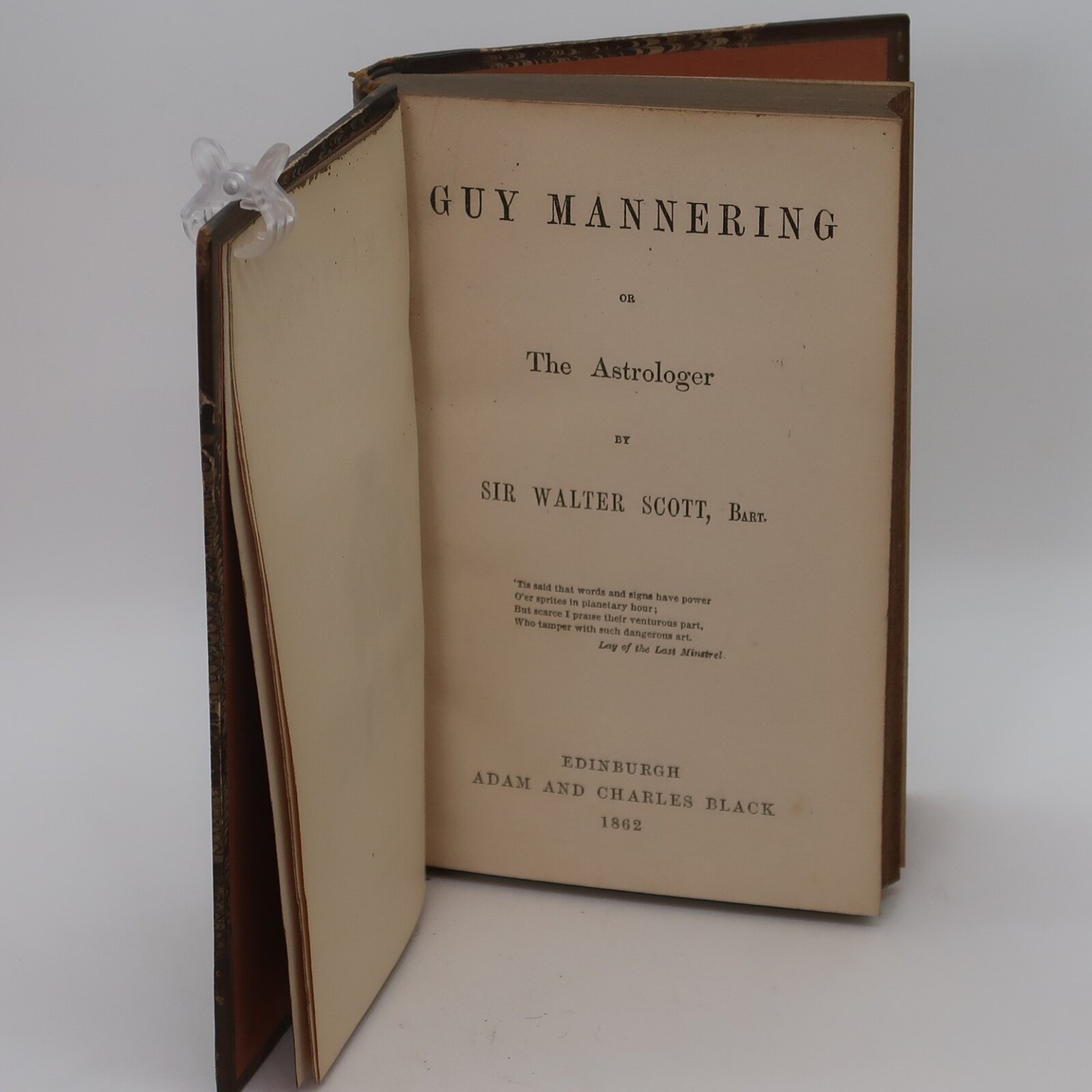 Guy Mannering; or, The Astrologer is the second of the Waverley novels by Walter Scott, published anonymously in 1815. According to an introduction that Scott wrote in 1829, he had originally intended to write a story of the supernatural but changed his mind soon after starting. The book was a huge success, the first edition selling out on the first day of publication. Scott began the composition of Guy Mannering in the last days of 1814, immediately after completing his last long narrative poem The Lord of the Isles. Writing with remarkable speed, he finished it by mid-February 1815.