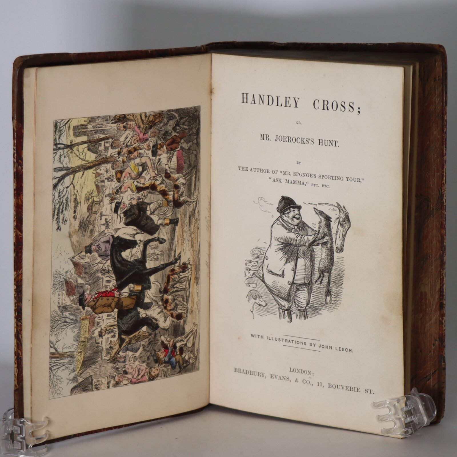 Tan leather spine with red title plate, raised banding, gilt decoration and lettering. Faded red marbled boards and edges.