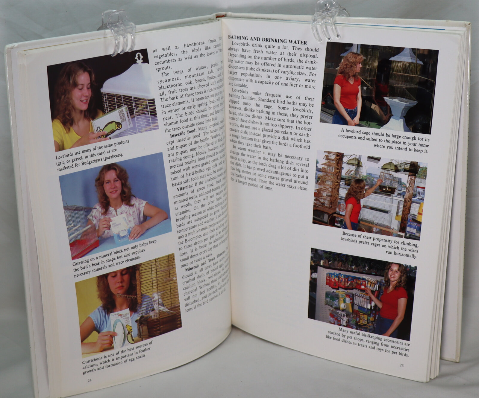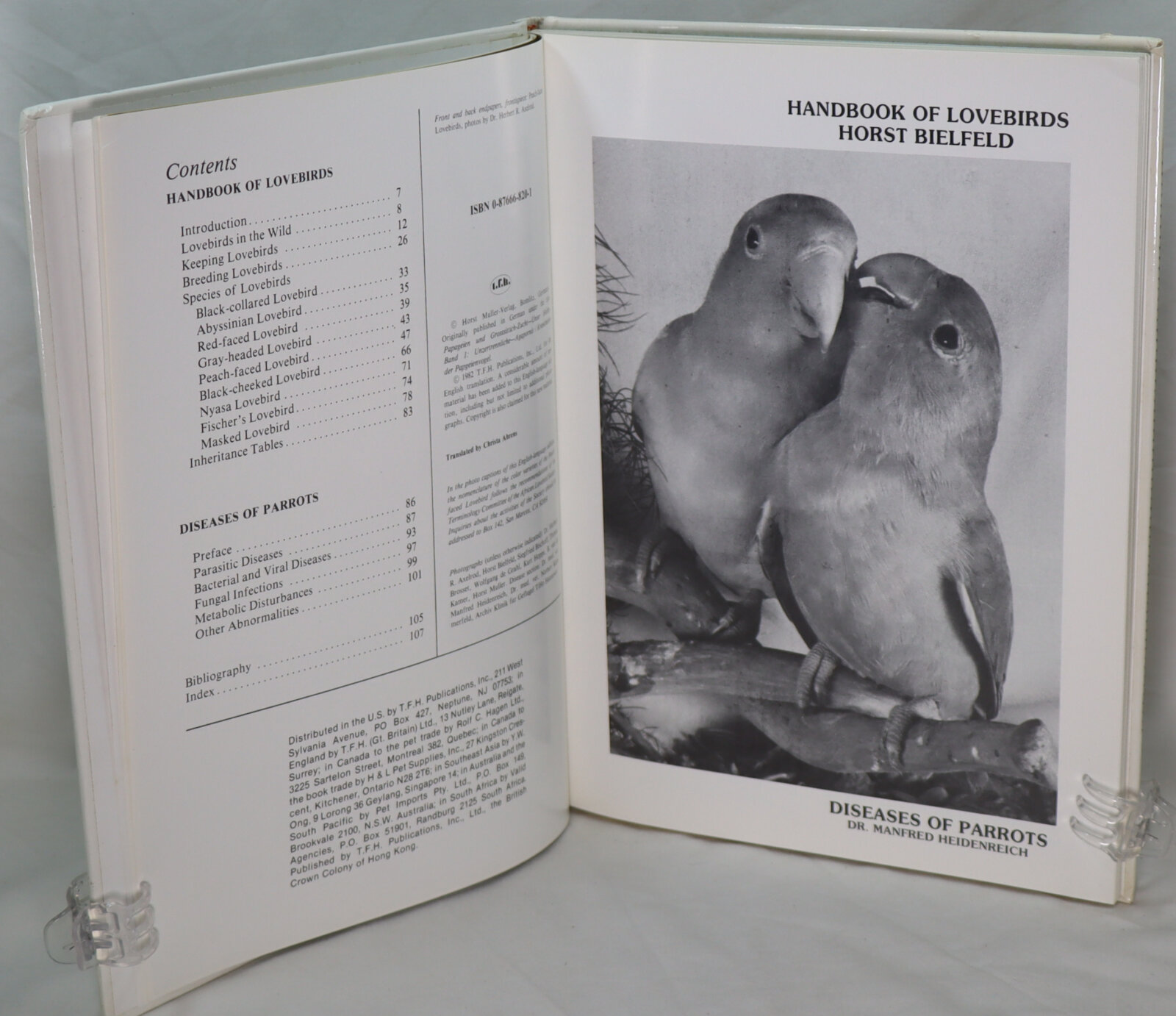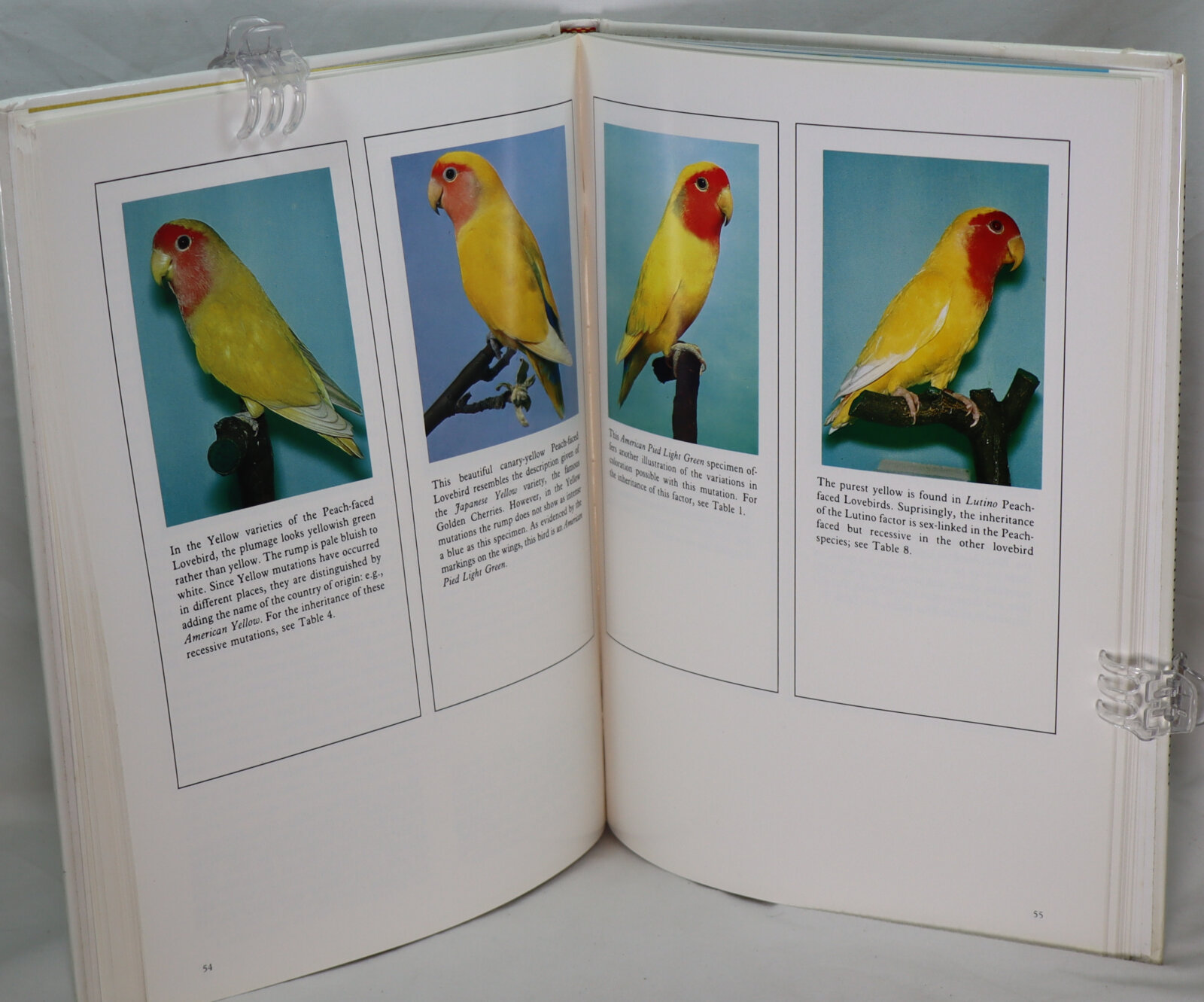 Glossy white board binding with black title and photographs of parrots on the front board.
