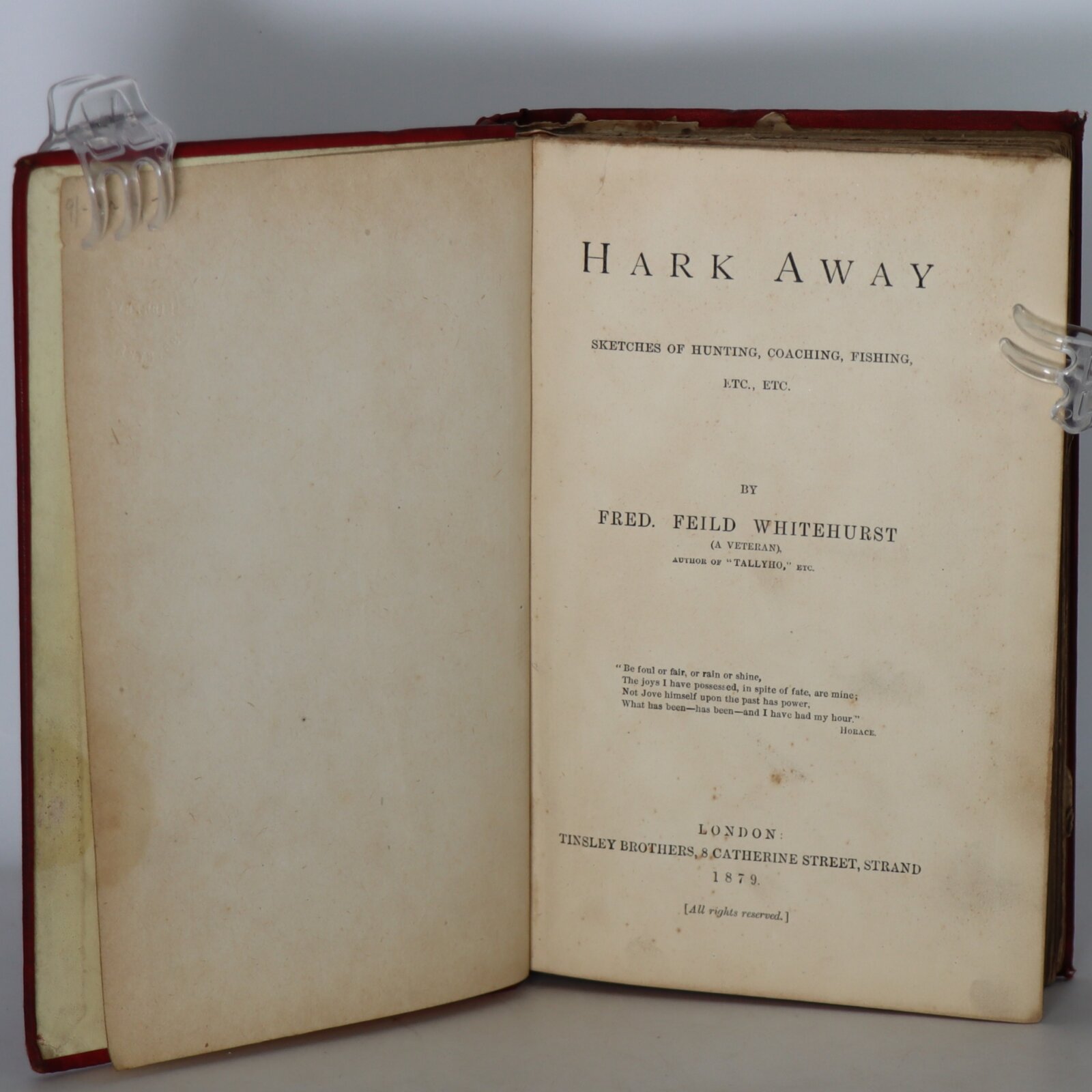 Red cloth binding with gilt title on the spine. Gilt hunter with black decoration on the front board.