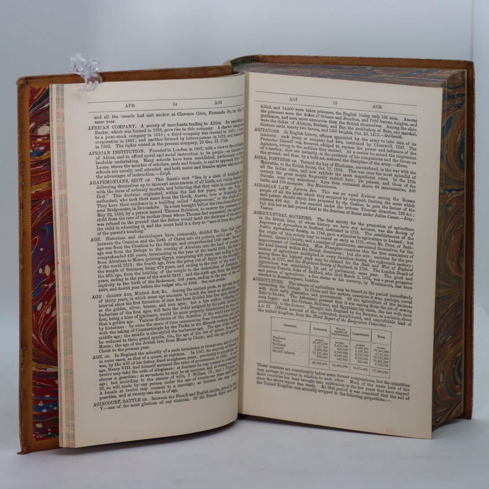 Tan full leather binding. Gilt edge banding on both boards. Red title pate with Gilt lettering and ornate decoration on the spine. All edges and pastedowns marbled.