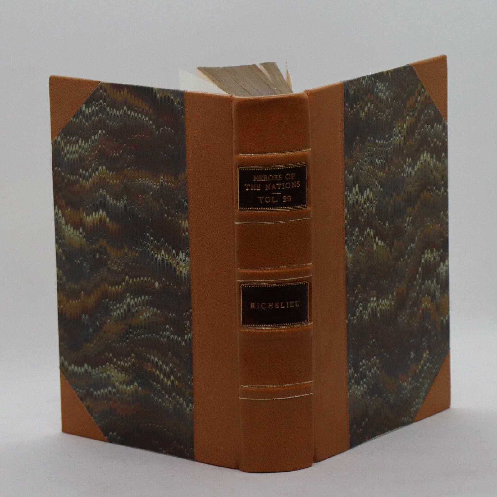 Tan calf binding, brown name plates. Gilt title and spine decoration. Tan marbled boards.
