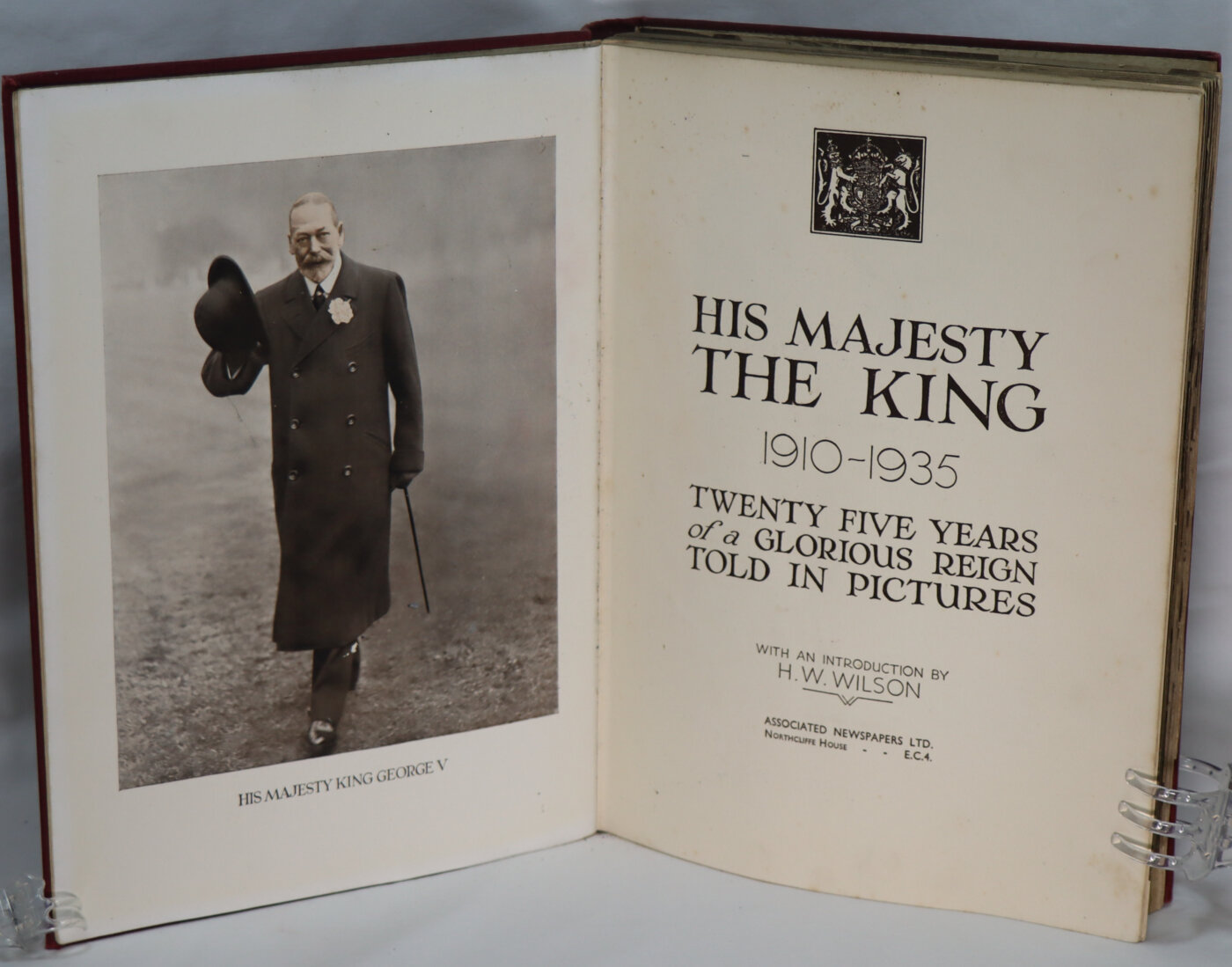 Hardcover. Condition: Very Good. Large hardback in original burgundy cloth boards, gilt titles, size 31 x 24cm, some creasing to the front endpaper otherwise in Good condition.  Fully illustrated with b&w photographs, with an introduction by H.W. Wilson. His Majesty the King 1910 – 1935 Twenty Five Years of a Glorious Reign Told in Pictures, 300 pages.