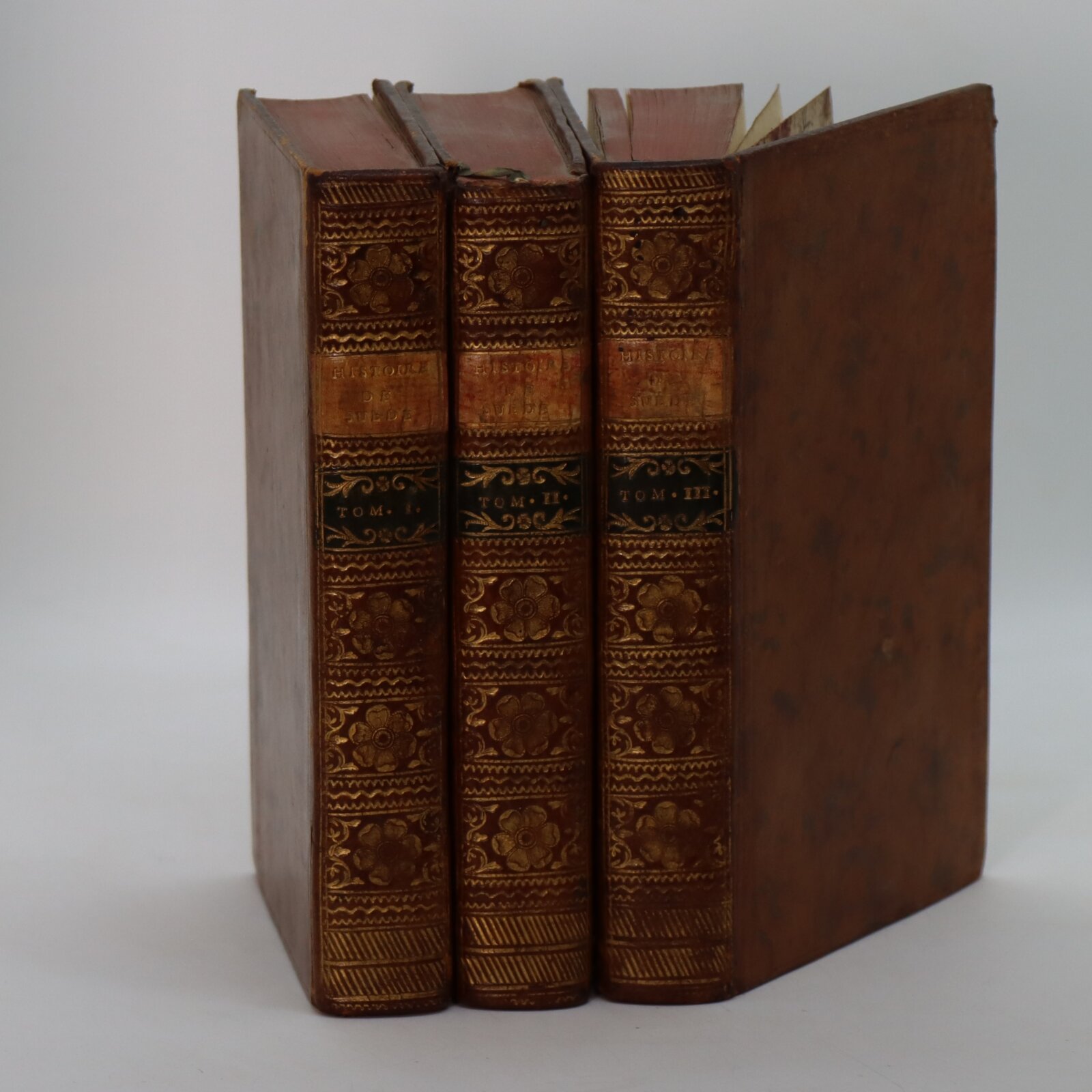 Calf binding. Green and reddish title plates with gilt lettering and ornate decoration on the spine. Dimensions are for one volume.