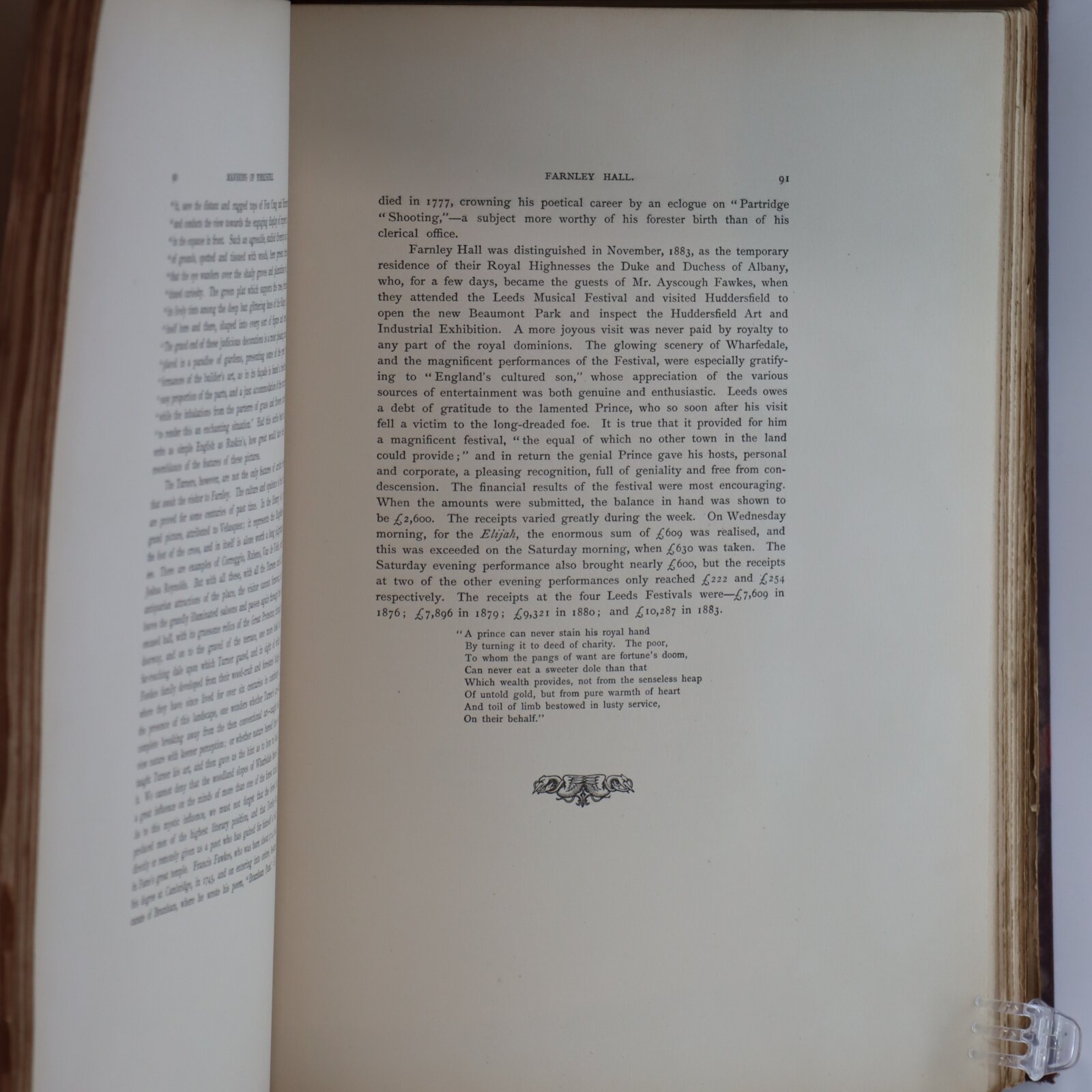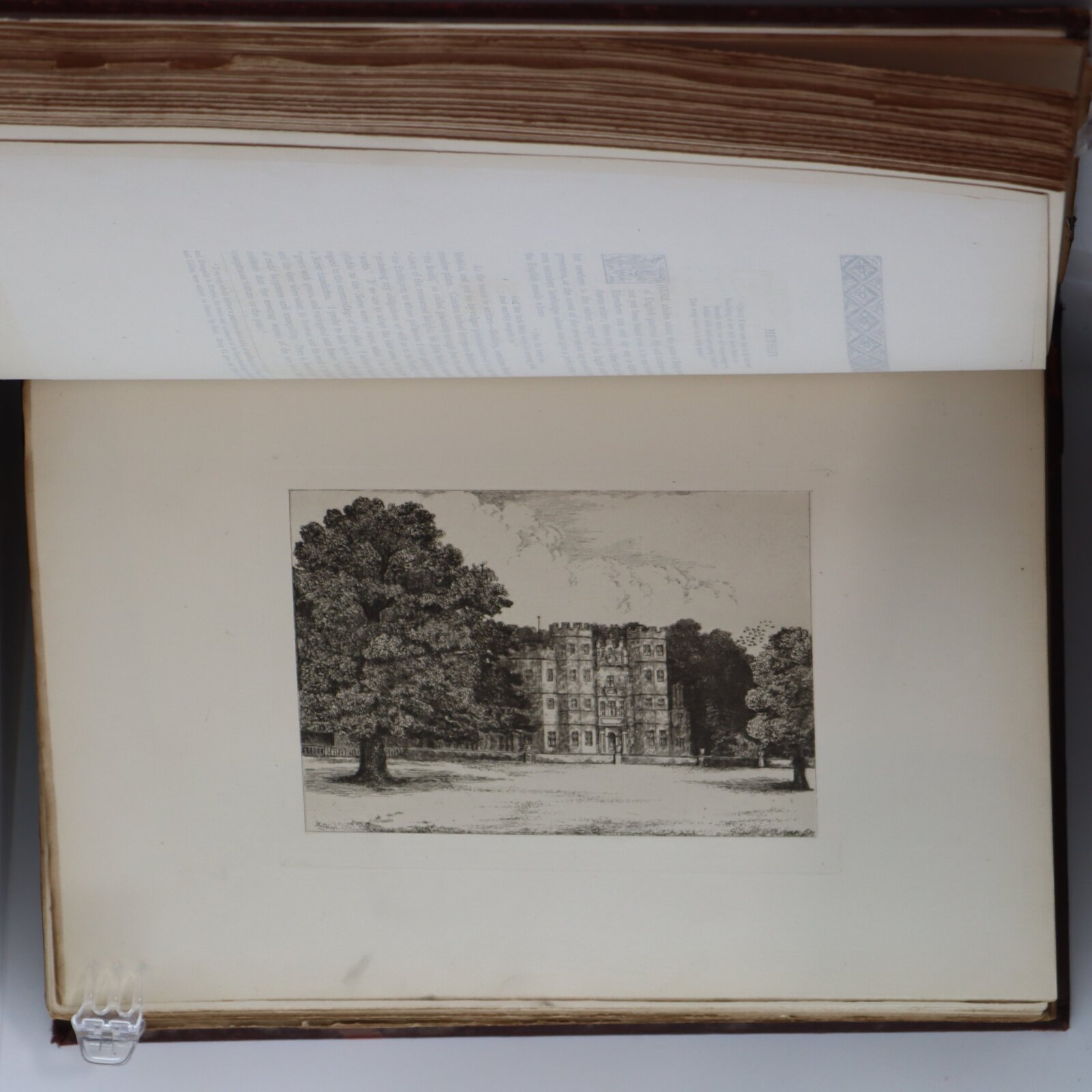 Dark brown leather spine with cloth boards. Gilt castle engaving and title on the front board.Gilt title on the spine. No. 41 of a limited edition of 150.
