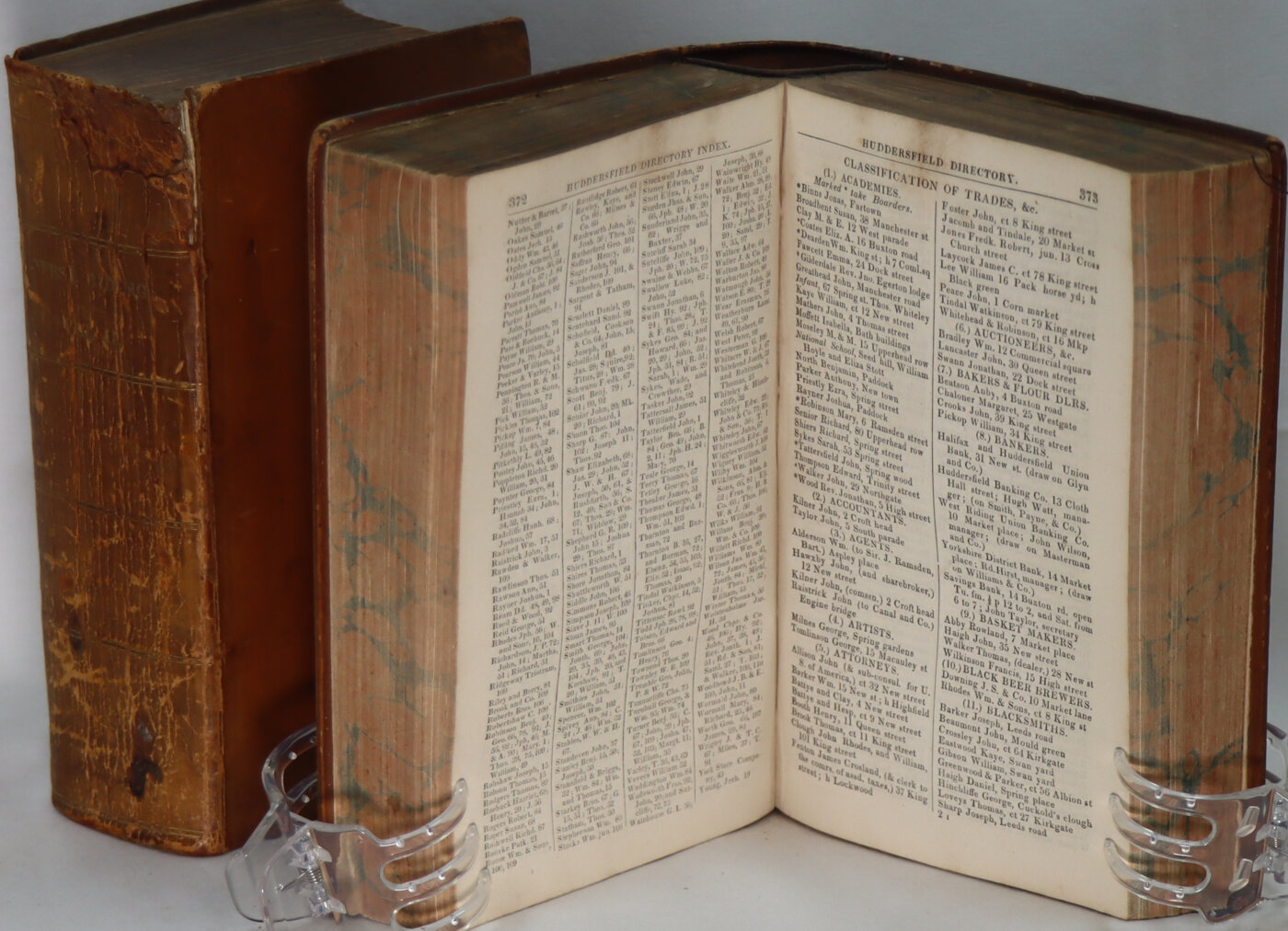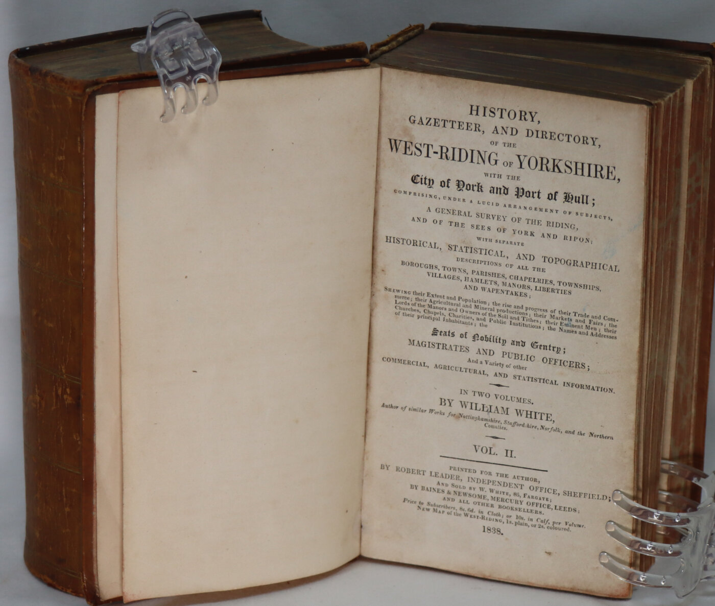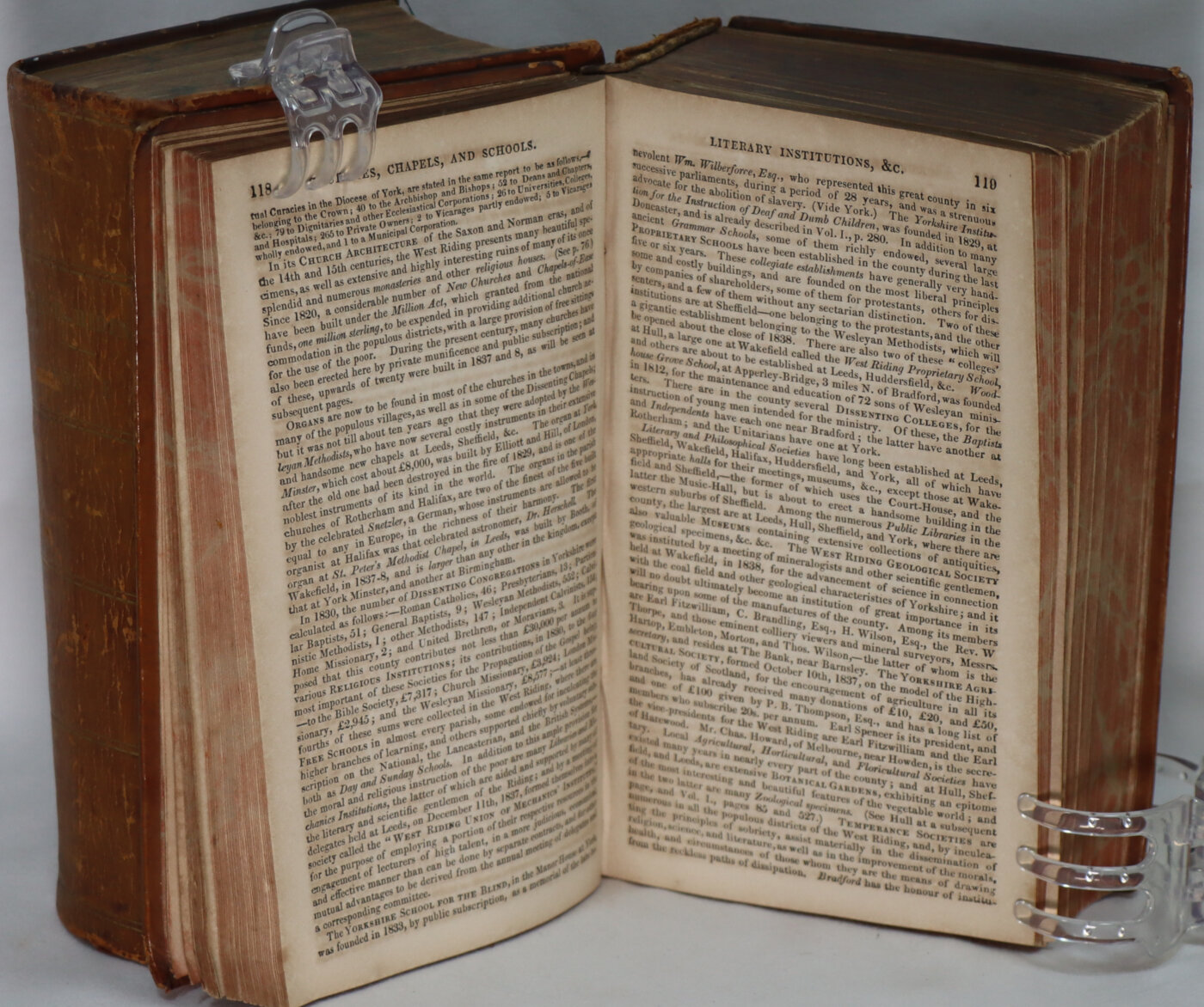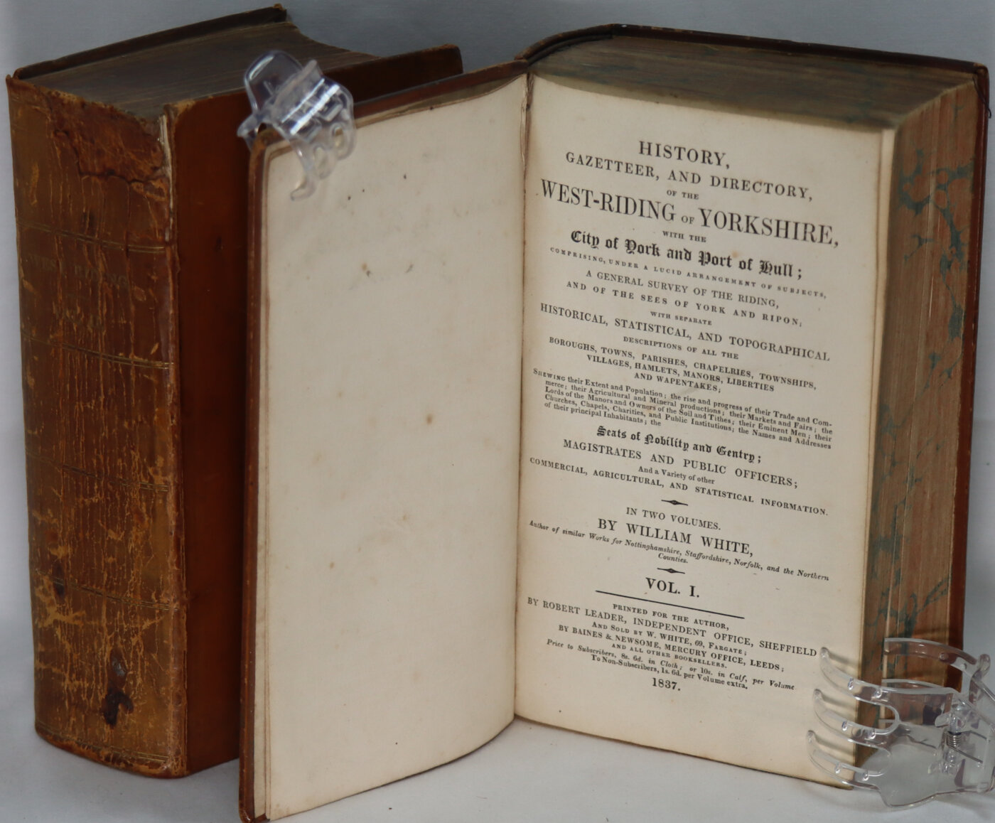 All edges marbled; marbled endpapers. ; 8vo 8″ – 9″ tall; 780 pages; Physical description: 1v.: xi, 780p. ; 18cm. Subjects: Directories – York – 1837 – Geography – England – Yorkshire – 19th century. Notes: Includes advertisements after the main text. Spine title: West Riding, volume 1. Full title: History, gazetteer and directory, of the West-Riding of Yorkshire : with the city of York and port of Hull; comprising, under a lucid arrangement of subjects, a general survey of the riding, and of the Sees of York and Ripon; with separate historical, statistical, and topographical descriptions of all the boroughs, towns, parishes, chapelries, townships, villages, hamlets, manors, liberties and wapentakes; showing their extent and population; the rise and progress of their trade and commerce; their agricultural and mineral productions; their markets and fairs; the lords of the manors and owners of the soil and tithes; their eminent men; their churches, chapels, charities, and public institutions; the names and addresses of their principal inhabitants; the seats of nobility and gentry; magistrates and public officers; and a variety of other commercial, agricultural, and statistical information.